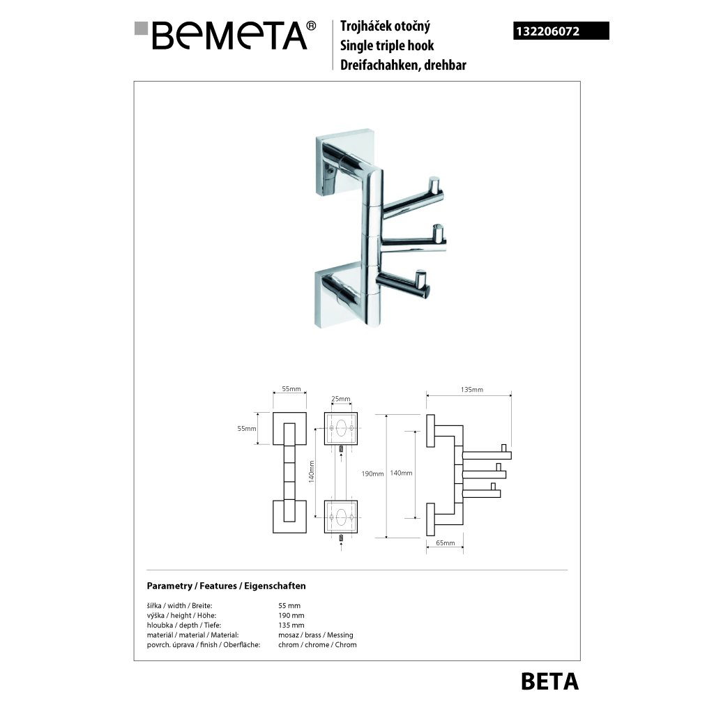 BETA: Věšák, se 3 háčky, otočný - 132206072