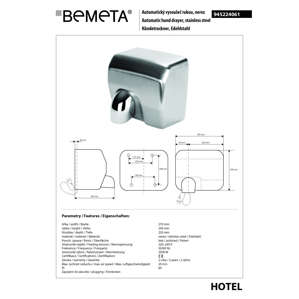 Bezdotykový osoušeč rukou, 2500 W, nerez, lesk - 945224061