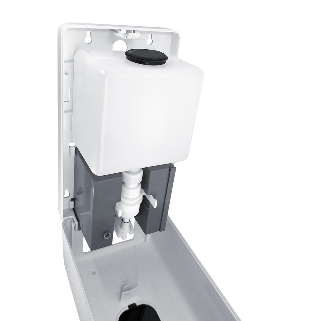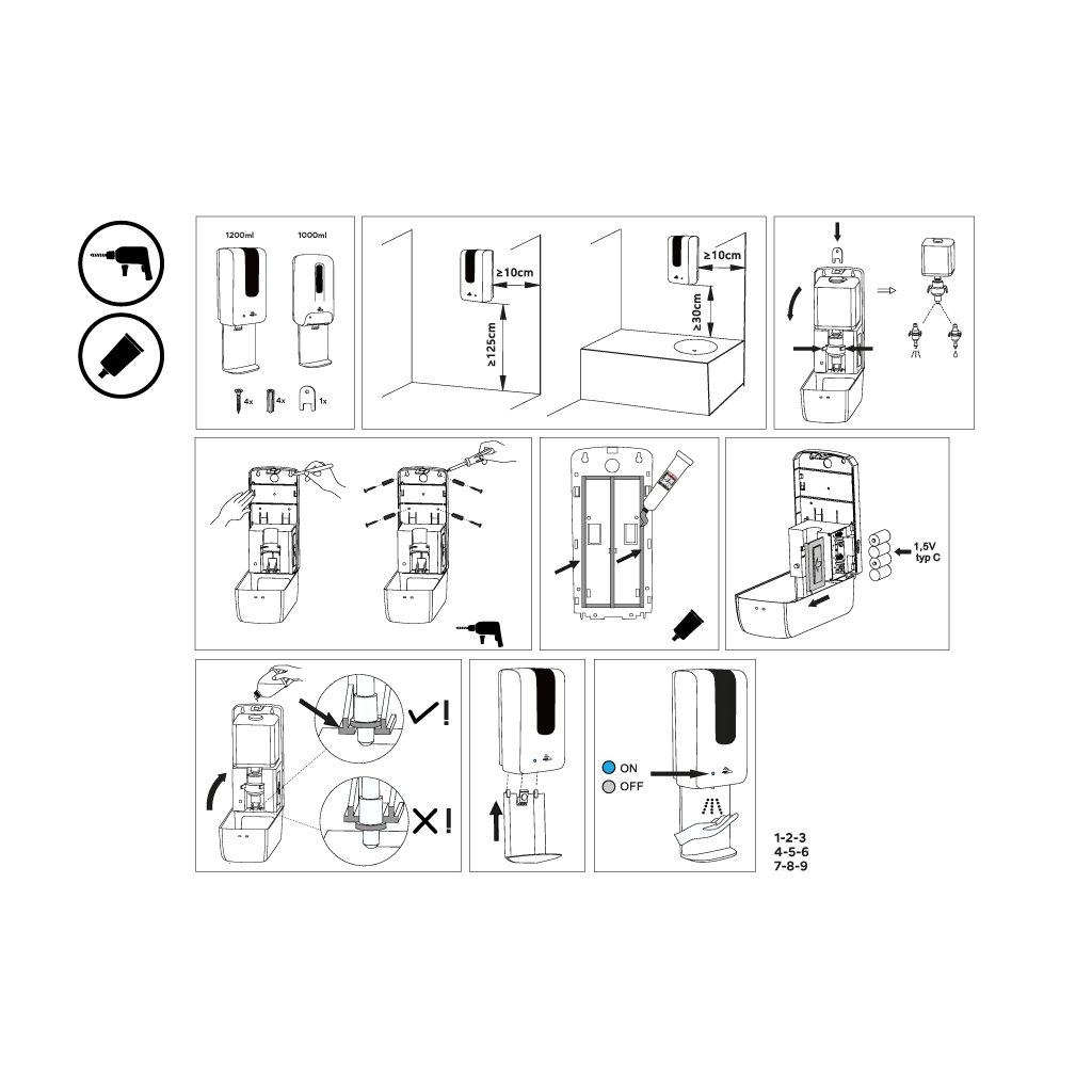 Bezdotykový dávkovač mýdla nebo dezinfekčního gelu 1,2l s odkapávačem a průzorem, automatický je skvělým doplňkem do koupelny. Balení obsahuje 4 šrouby, 4 hmoždinky, klíč k otevírání zásobníku, odkapávač. Výrobek je určený k navrtání i k nalepení. Lepidlo MAMUT ani baterie typu C nejsou součástí výrobku. Lepidlo lze dokoupit pod artiklovým číslem 35003TU. K nalepení bude potřeba 1 tuba lepidla MAMUT. Přístroj je nutné vybavit 4 ks baterií 1,5V typ C. Kvalitní baterie vydrží až 60 tis dávkování. Dobíjecí baterie jsou zakázány! Objem zásobníku 1200 ml. Objem jedné dávky 1,5 ml. Životnost dávkovací pumpičky 300 tis dávek. K dávkovači lze dokoupit pumpu na dezinfekční roztok. Odkapávač zabraňuje nechtěnému znečištění v okolí dávkovače. Senzorový dávkovač není uzpůsoben do sprchového koutu pro přímý kontakt s vodou. V přední části dávkovače je umístěna LED kontrolka, která upozorňuje na nízký stav baterie. Při montáži je nutné dodržet vzdálenost mezi umyvadlem a dávkovačem 30 cm! Dávkovač je vyroben z ABS plastu, který je odolný vůči mechanickému poškození. Plast je tuhý, houževnatý, zdravotně nezávadný.VŠEOBECNÝ NÁVOD K MONTÁŽI VÝROBKŮ