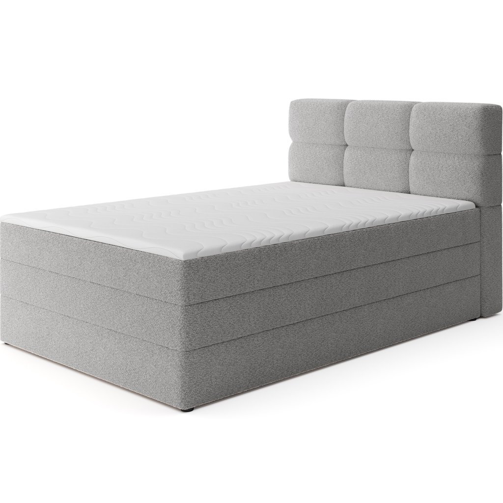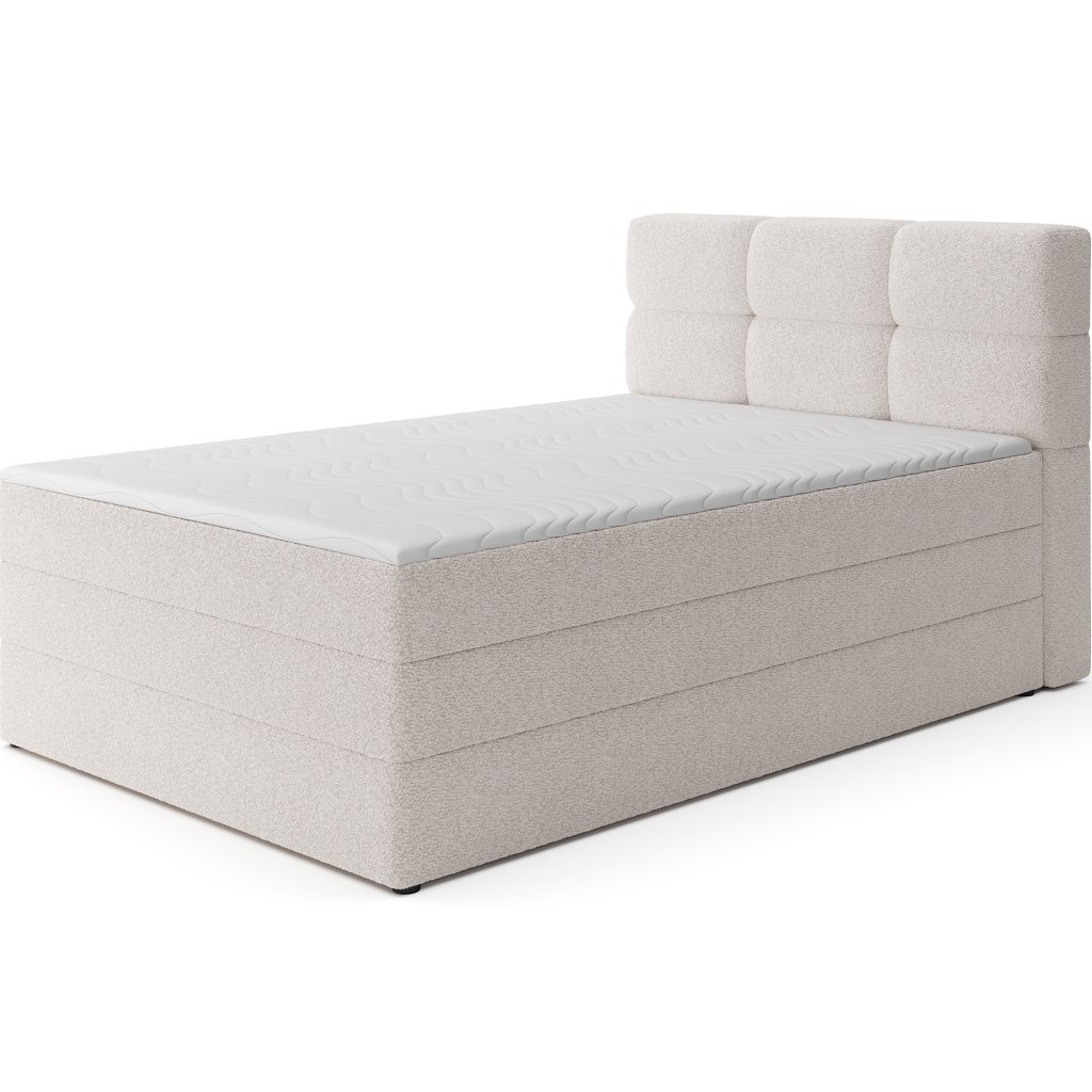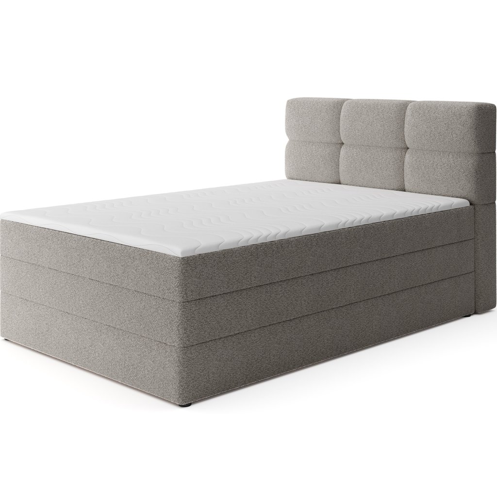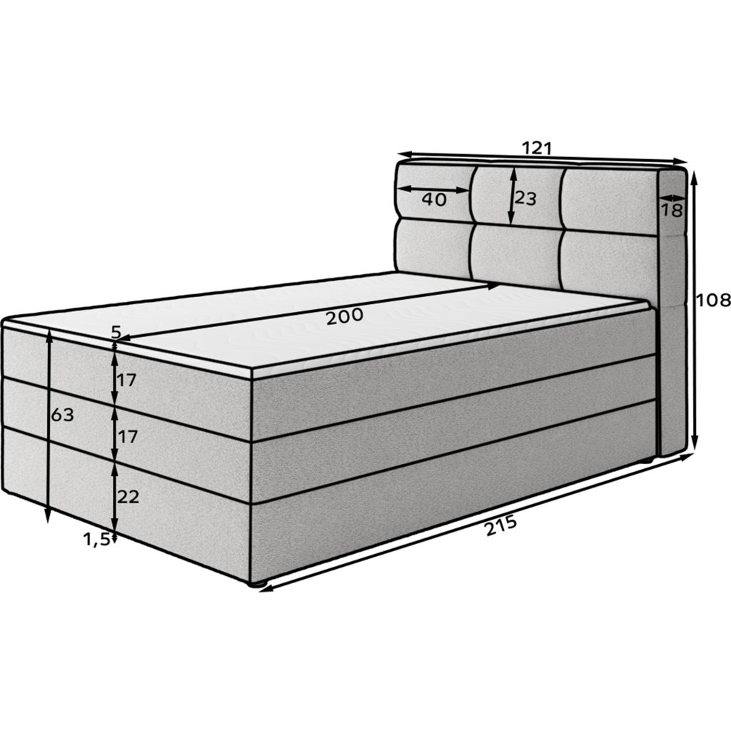 Kontinentální postel Kasped je moderní a funkční volbou pro každou ložnici. Dostupná ve dvou rozměrech – 215x121x108 cm a 215x141x108 cm – umožňuje snadné přizpůsobení individuálním potřebám i velikosti interiéru. Konstrukce postele je založena na pevné rámové základně z masivního dřeva a dřevotřísky, což zajišťuje stabilitu a dlouhou životnost. Středem komfortu je vestavěná matrace s bonelovými pružinami, které poskytují ergonomickou oporu těla a podporují správnou cirkulaci vzduchu během spánku.