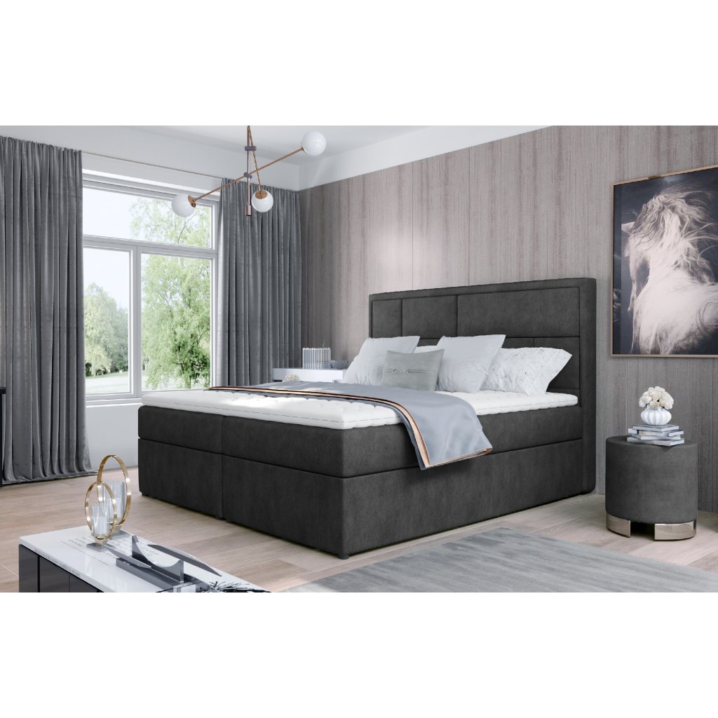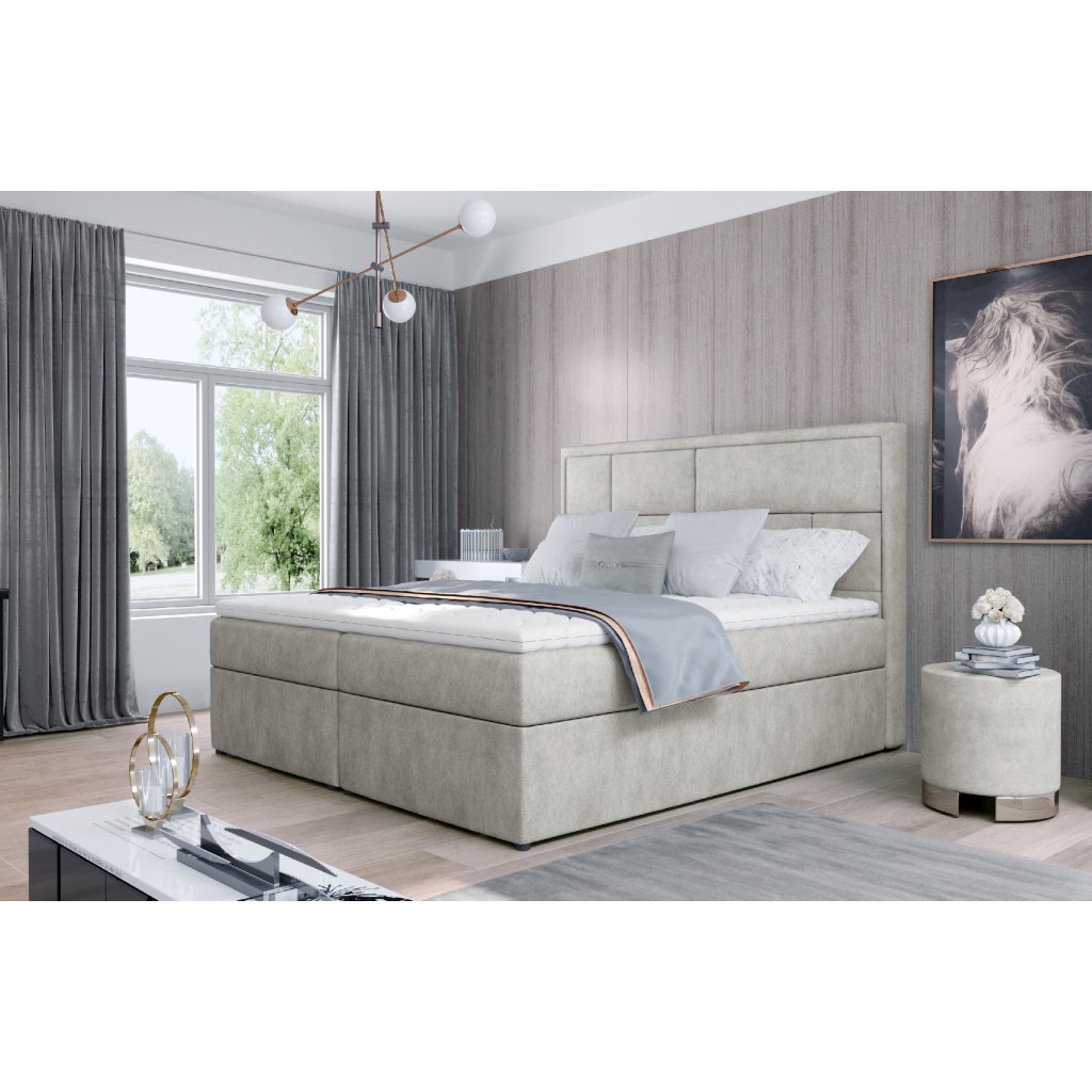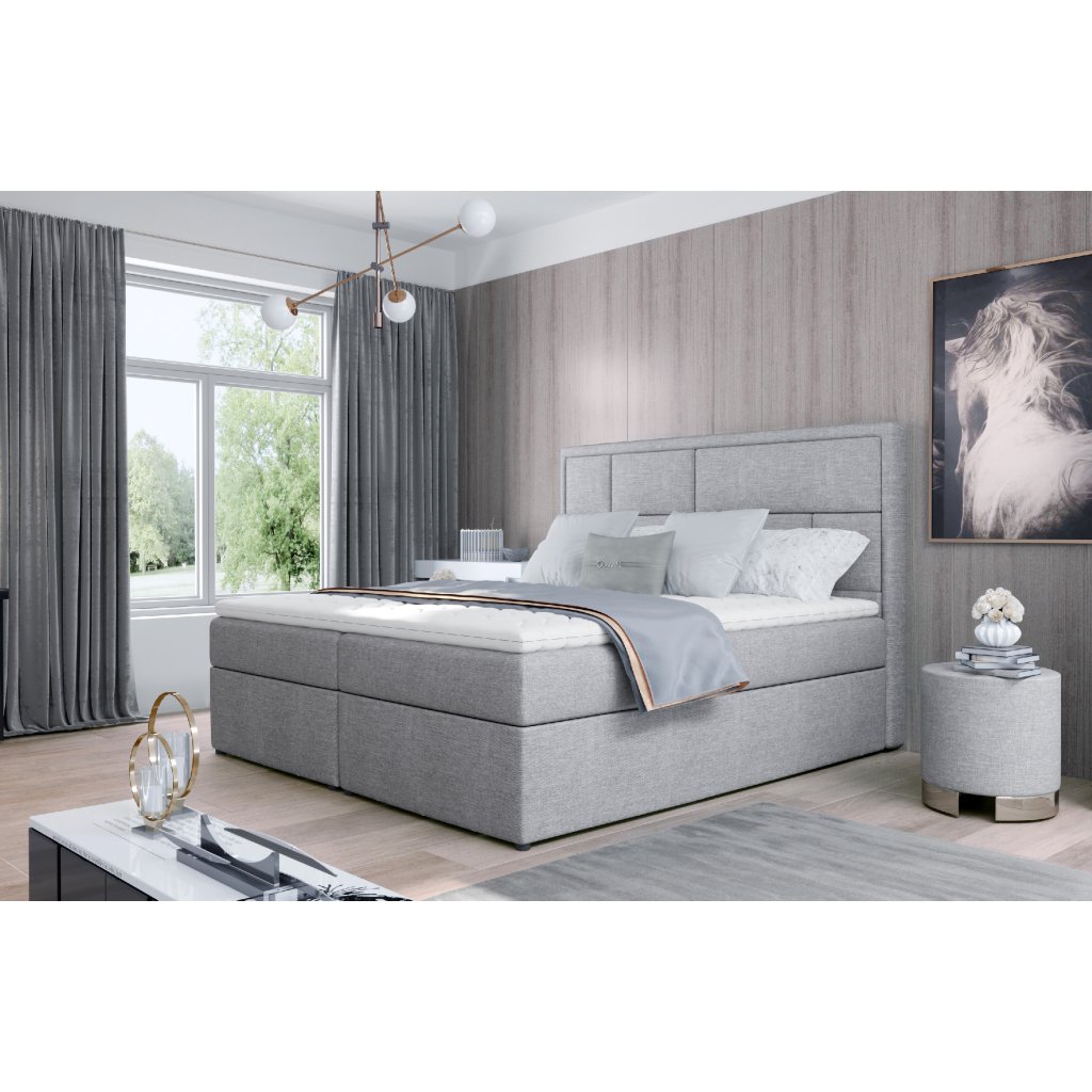 Meron je vkusná, elegantní, dokonale měkká a pohodlná kontinentální postel boxspring v moderním klasickém stylu, která je k dispozici ve třech velikostech: 140/ 160/ 180 x 200 cm. Výjimečné pohodlí umocňuje vysoký 53 cm sedák a výplň postele. Bonellová matrace a pěna T25 poskytují uživateli nábytku nejvyšší komfort a dokonale stabilizují polohu těla během odpočinku. Takové řešení zaručuje pohodlný odpočinek pro každého, protože zdravý spánek je přece dobrý spánek! Kromě značného komfortu stojí za zmínku také povrchová úprava jednotlivých prvků modelu Meron. Vysoký podhlavník, ušitý do tvaru nepravidelných obdélníků, je jak měkkou, pohodlnou a neocenitelnou oporou, tak zajímavou ozdobou ložnice. Díky dvěma prostorným kontejnerům na lůžkoviny - náš boxspring je nejen funkčním vybavením vašeho domova, ale také vaší vlastní oázou klidu, díky níž je používání takové postele - skutečným potěšením. Stojí za to mít ve svém bytě postel jako Meron - spokojenost zaručena.Parametry produktu:
