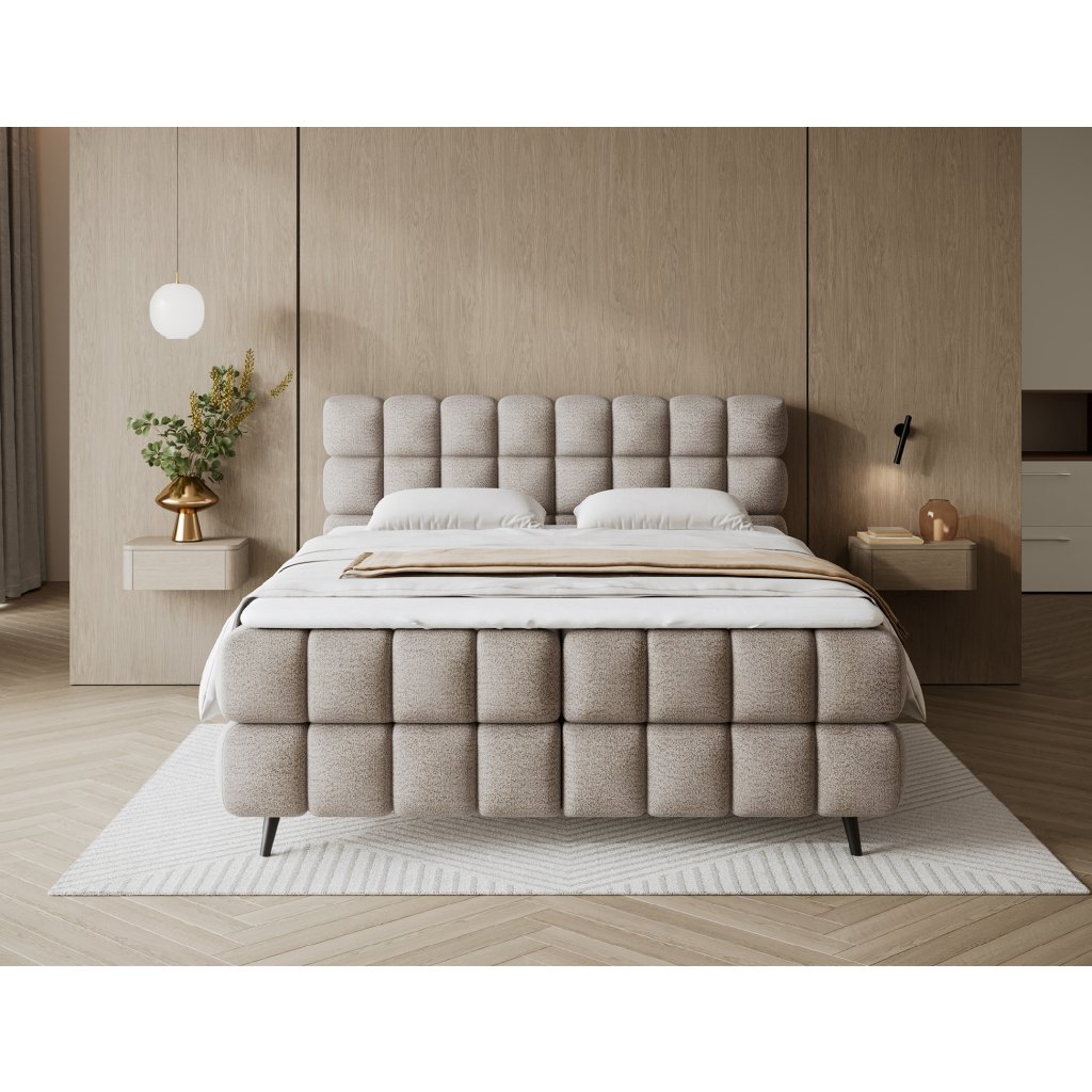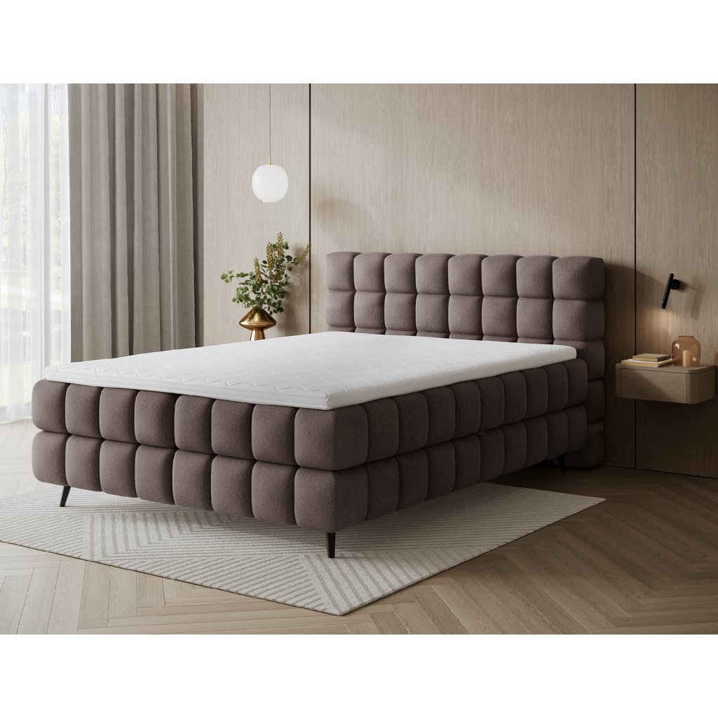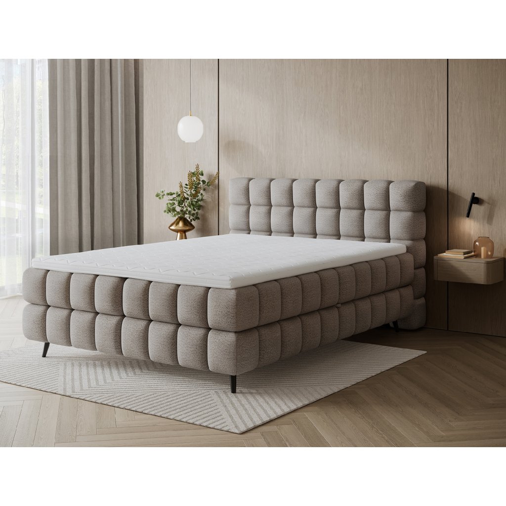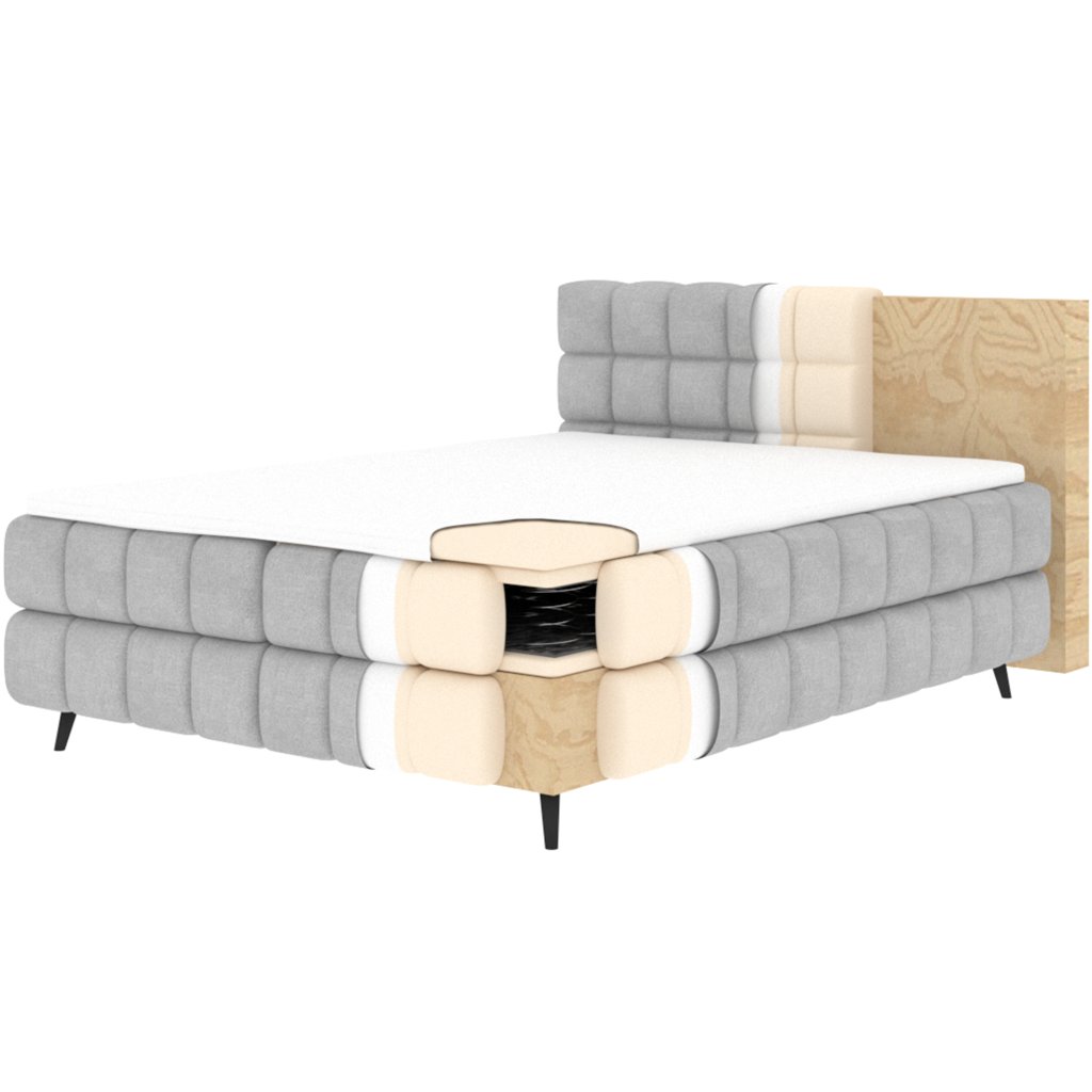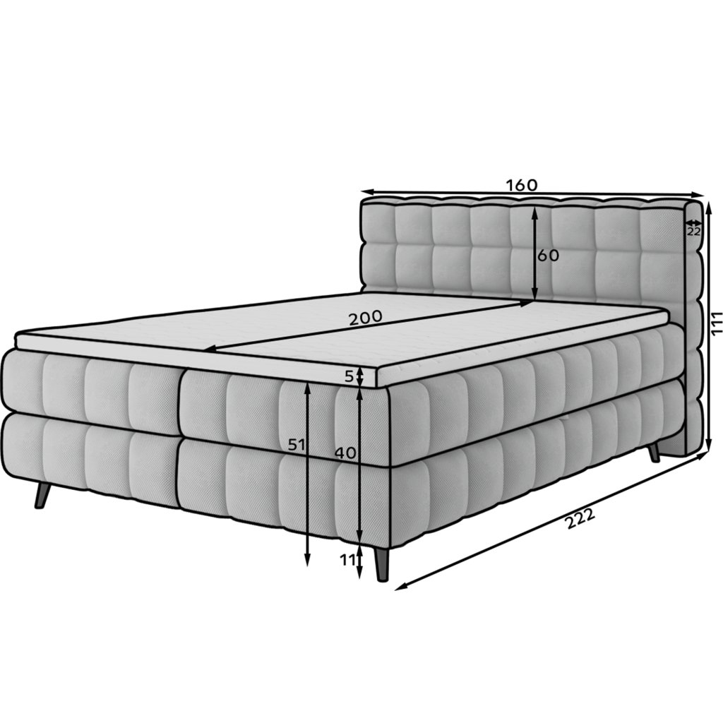 Kontinentální postel Sabeno představuje spojení elegance, funkčnosti a pohodlí. Je dostupná ve třech rozměrech – 140×200 cm, 160×200 cm a 180×200 cm – takže ji lze snadno přizpůsobit individuálním potřebám. Celková výška konstrukce je 111 cm a hloubka 222 cm, díky čemuž působí postel stabilně a reprezentativně. Vnitřní část tvoří kombinace bonelových pružin a pěny T2540, které poskytují ideální podporu těla a dlouhodobý komfort spánku.
