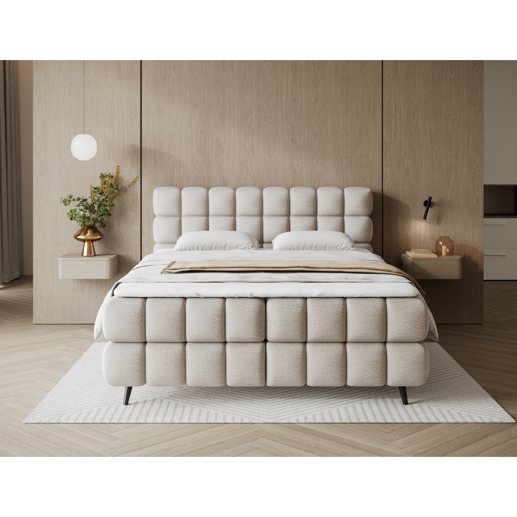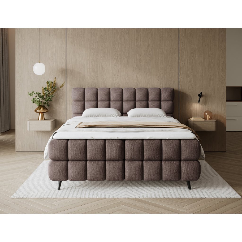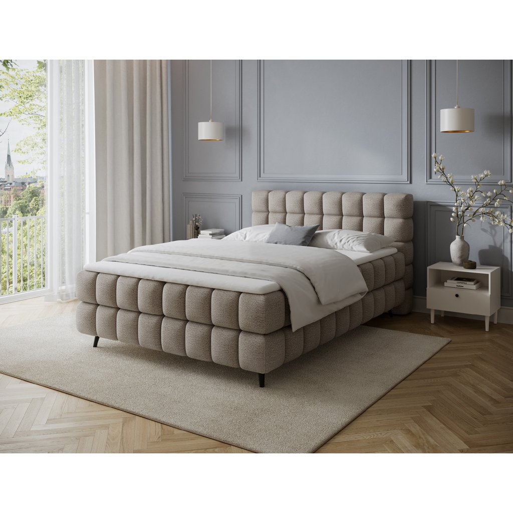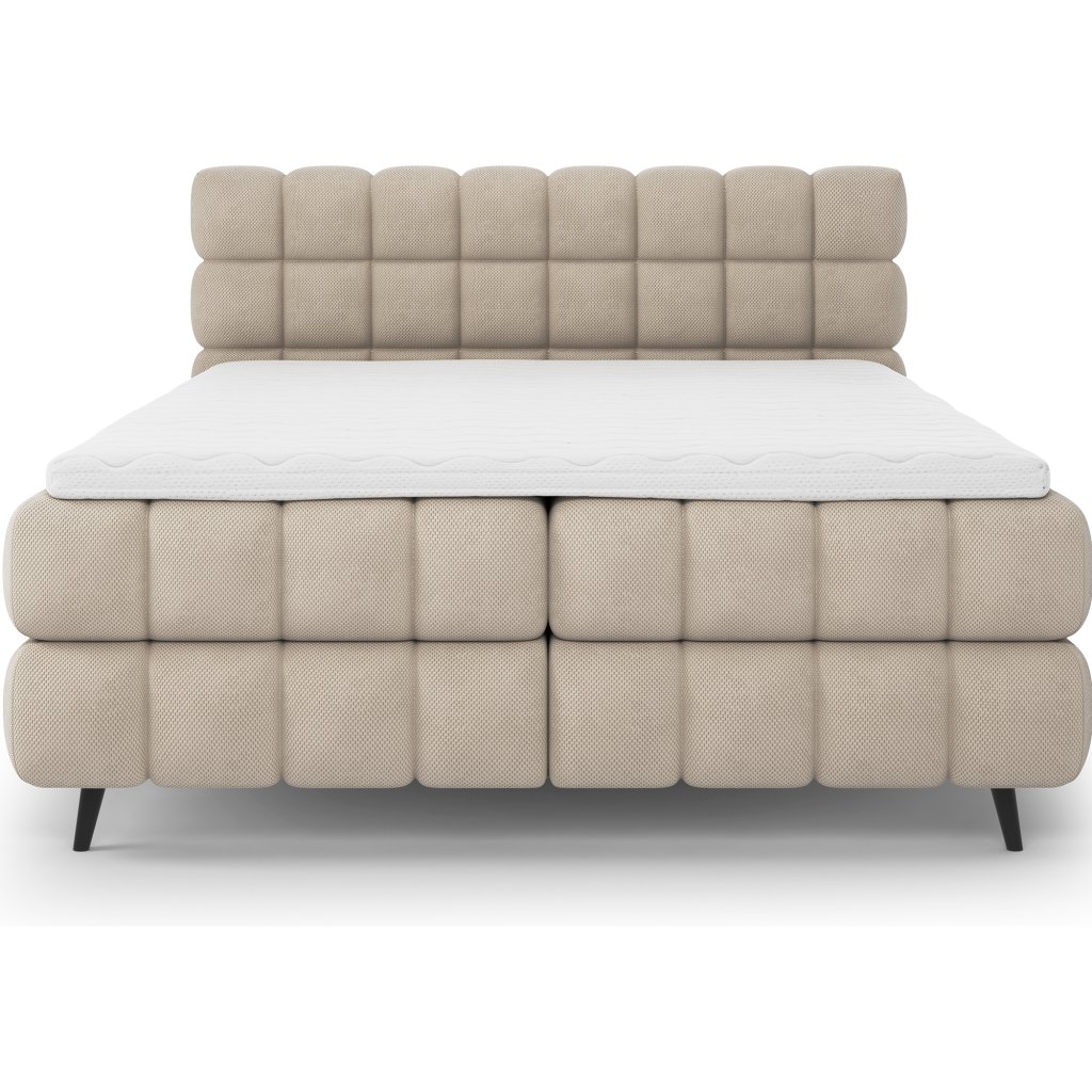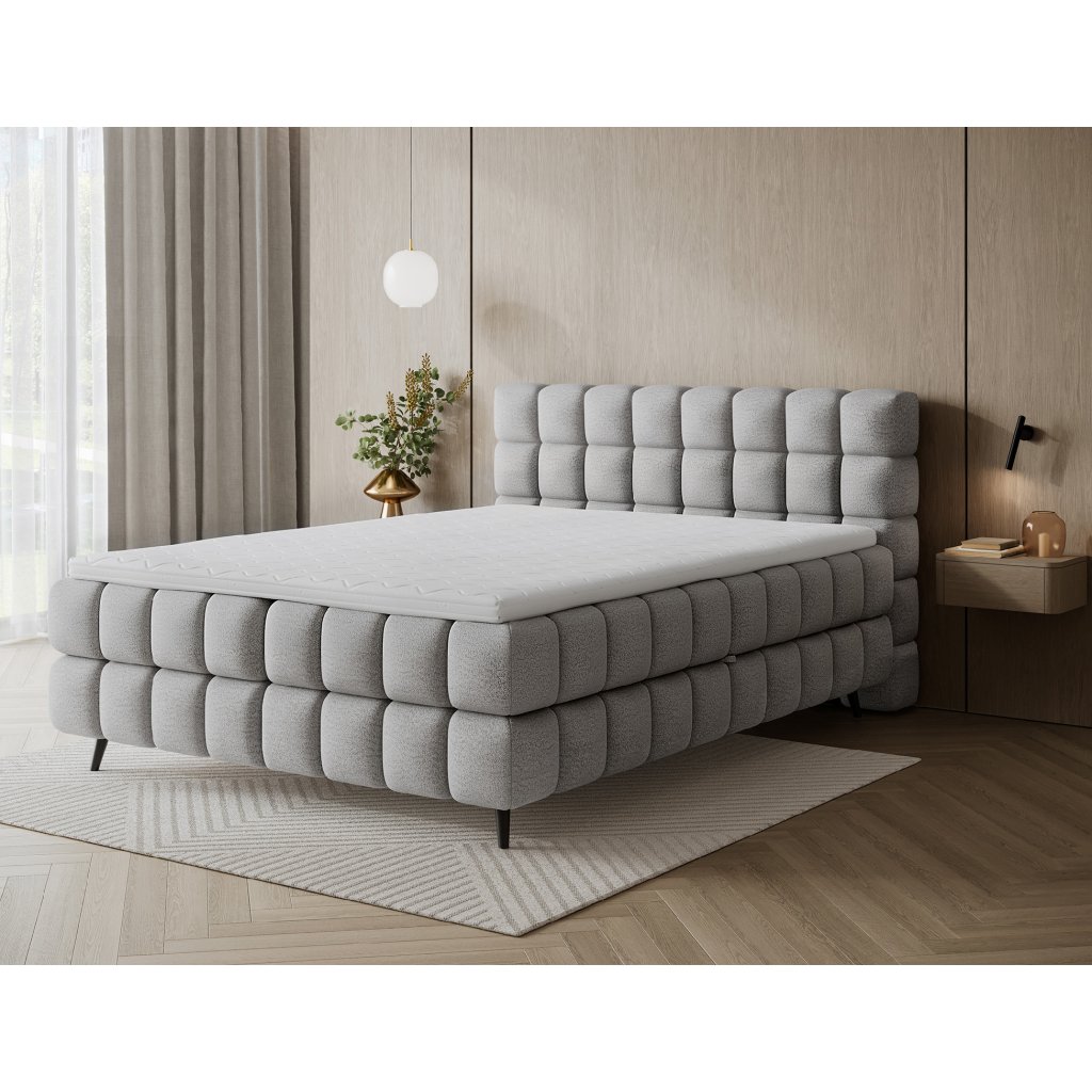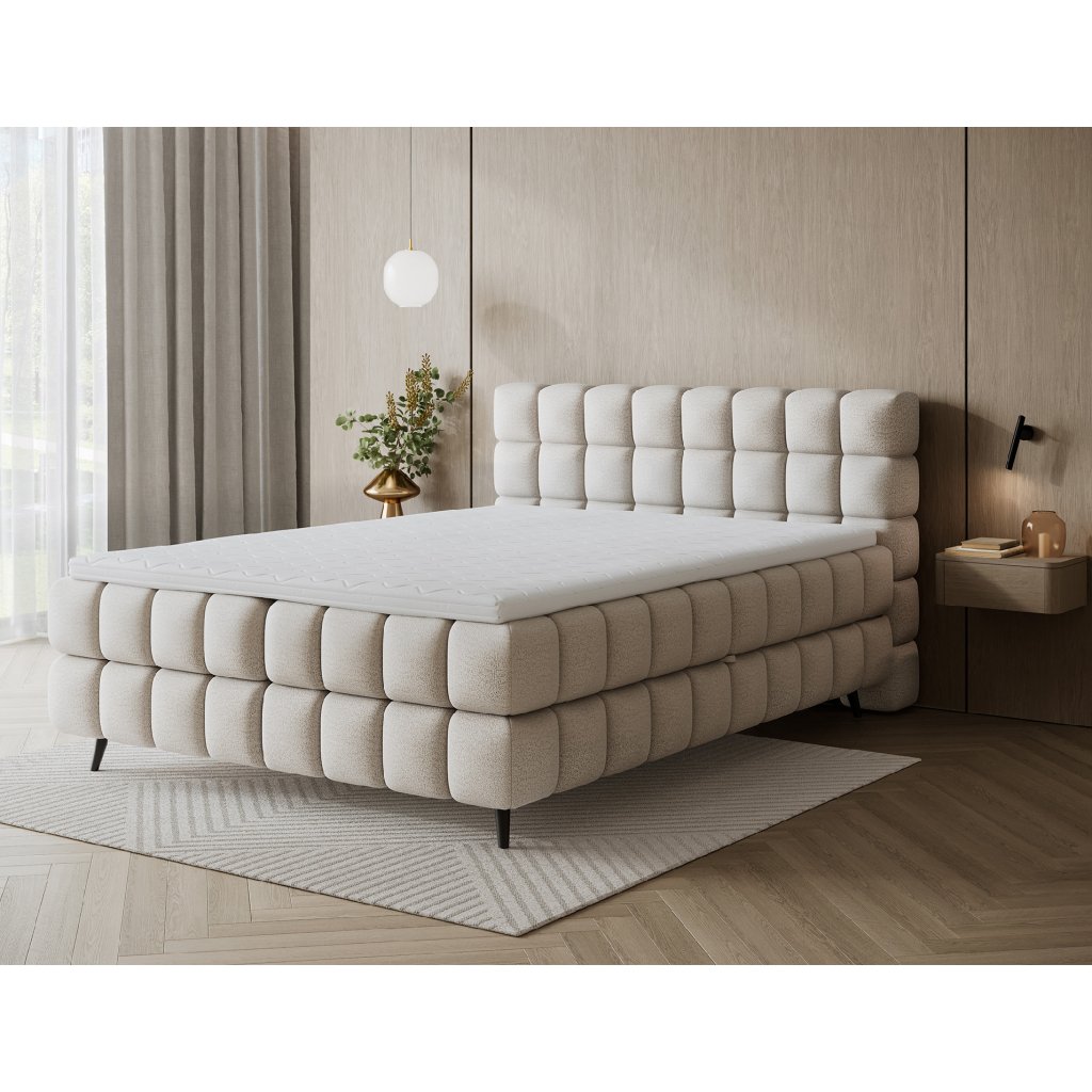 Kontinentální postel Sabeno představuje spojení elegance, funkčnosti a pohodlí. Je dostupná ve třech rozměrech – 140×200 cm, 160×200 cm a 180×200 cm – takže ji lze snadno přizpůsobit individuálním potřebám. Celková výška konstrukce je 111 cm a hloubka 222 cm, díky čemuž působí postel stabilně a reprezentativně. Vnitřní část tvoří kombinace bonelových pružin a pěny T2540, které poskytují ideální podporu těla a dlouhodobý komfort spánku.