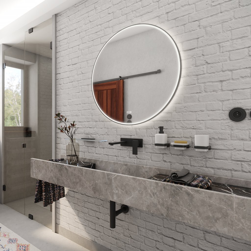 Kulaté zrcadlo s rámem a s celoobvodovým podsvícením pro dokonalé a rovnoměrné osvětlení.Zrcadlo se ovládá dvěma dotykovými podsvícenými senzory, které umožňují změnu barvy podsvícení, nastavení intenzity osvětlení (stmívání) a disponují paměťovou funkcí pro uložení posledního nastavení. Kromě toho lze zrcadlo ovládat i pomocí nástěnného vypínače, což zvyšuje jeho flexibilitu a pohodlí použití.