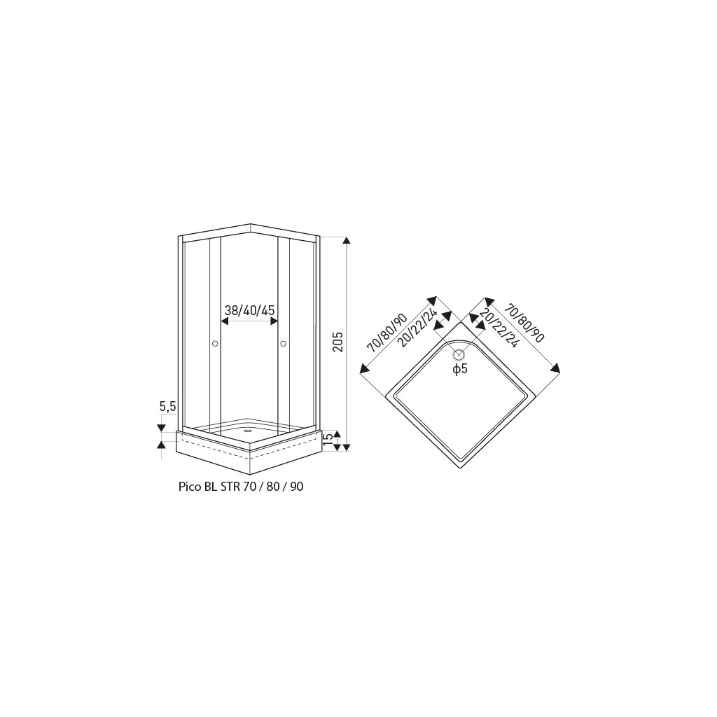 - Rozměry vaničky: 90 x 90 x 15 cm, vnitřní hloubka: 5,5 cm