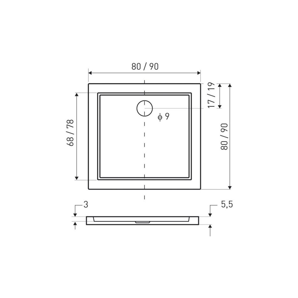 - Sprchová vanička: slim, rozměry: 80x80x5,5 cm
