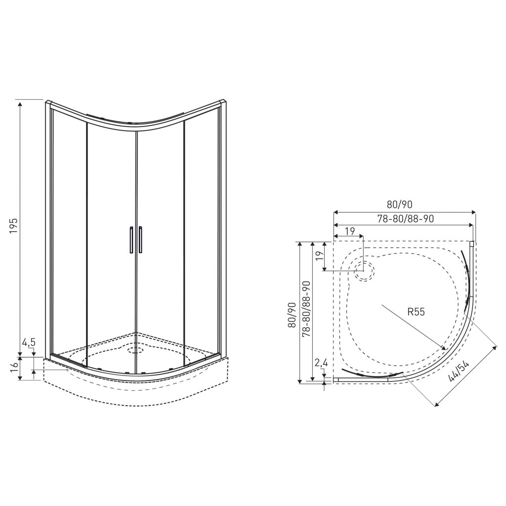 Tento čtvrtkruhový sprchový kout je navržen tak, aby poskytoval maximální komfort při každodenním používání a zároveň efektivně využíval prostor v koupelně. Je vybaven systémem dvoukřídlých posuvných dveří. Toto řešení je velmi praktické, protože dveře při otevírání nezasahují do prostoru místnosti, a zároveň umožňují vytvořit dostatečně široký a pohodlný vstup do sprchy. Stabilitu celé konstrukce zajišťují odolné hliníkové profily, které podtrhují moderní vzhled.