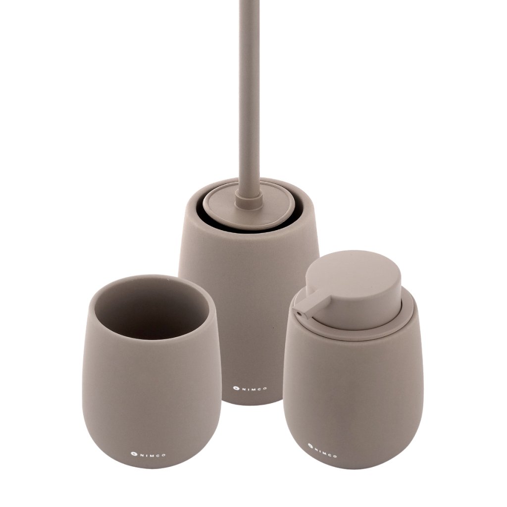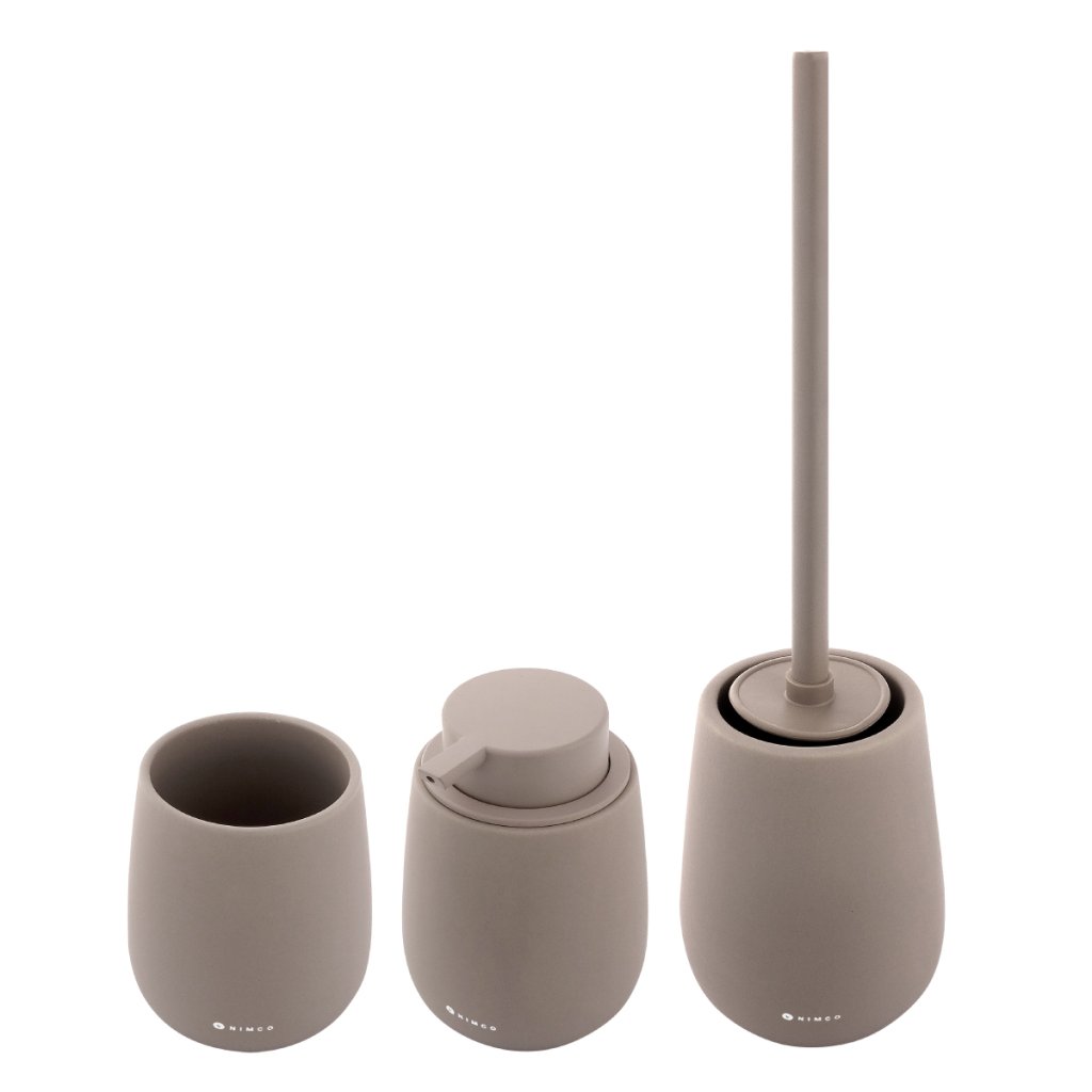 Sada doplňků do koupelny a WC obsahuje dávkovač tekutého mýdla, pohárek na zubní kartáčky a WC kartáč. Nádobky keramické Taupe hnědá matná. Soft-touch povrch. Speciální dodatečná povrchová úprava. Povrch je hebký, příjemný na dotek.Sada obsahuje tyto koupelnové a WC doplňky: