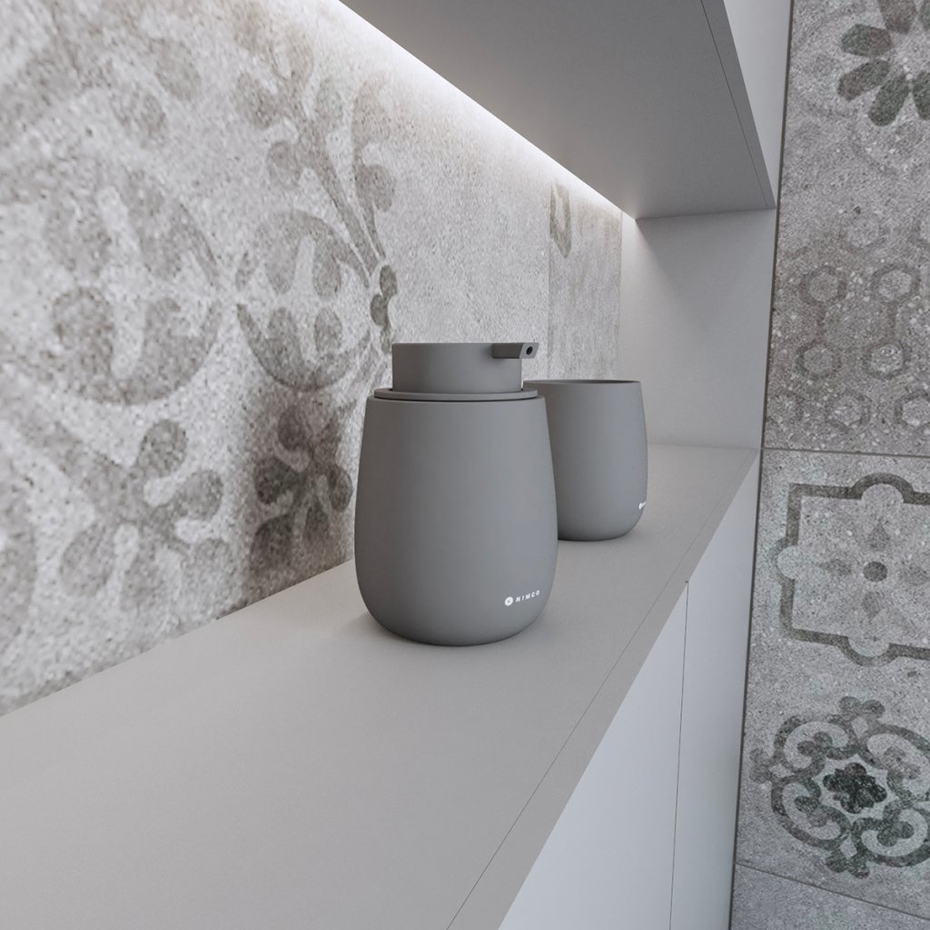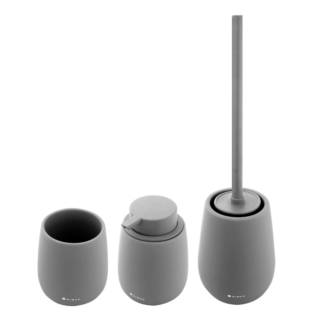 Sada doplňků do koupelny a WC obsahuje dávkovač tekutého mýdla, pohárek na zubní kartáčky a WC kartáč. Nádobky keramické tmavě šedé matné. Soft-touch povrch. Speciální dodatečná povrchová úprava. Povrch je hebký, příjemný na dotek.Sada obsahuje tyto koupelnové a WC doplňky: