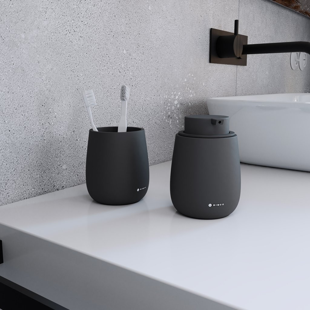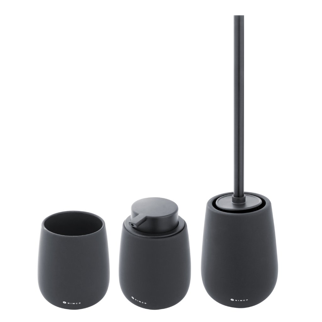 Sada doplňků do koupelny a WC obsahuje dávkovač tekutého mýdla, pohárek na zubní kartáčky a WC kartáč. Nádobky keramické černé matné. Soft-touch povrch. Speciální dodatečná povrchová úprava. Povrch je hebký, příjemný na dotek.Sada obsahuje tyto koupelnové a WC doplňky: