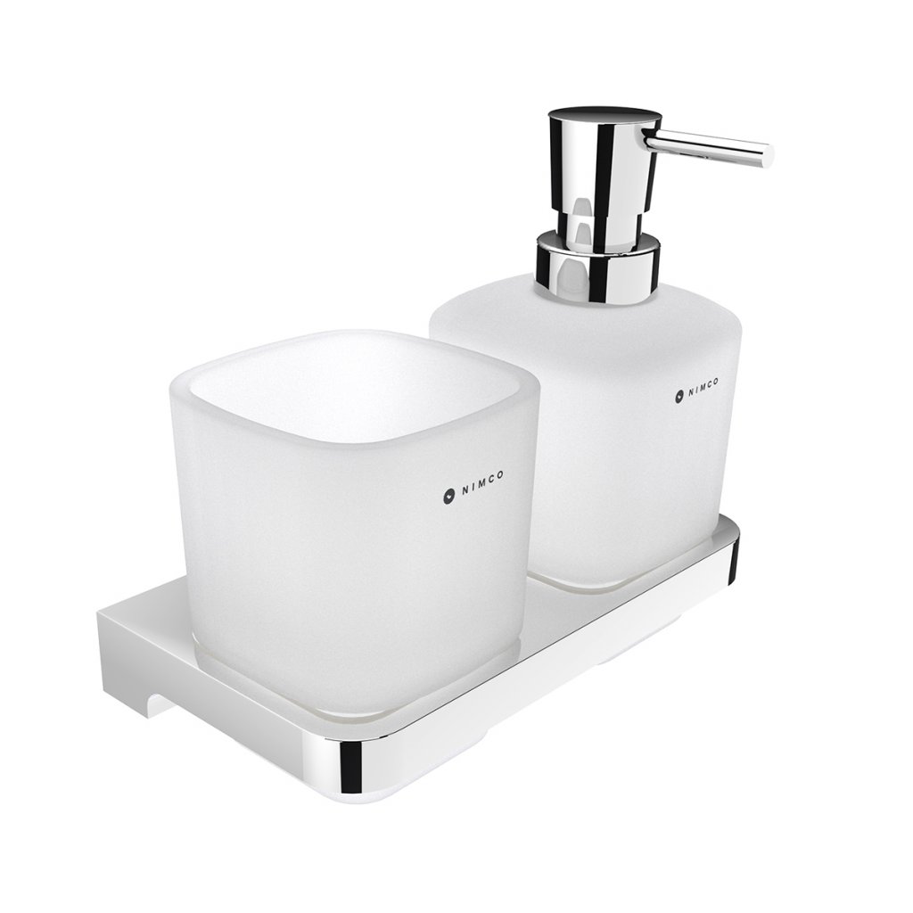Dvojitý nástěnný držák na dávkovač mýdla a pohárek na zubní kartáčky z matného skla. Skleněné nádobky v kombinaci s chromovaným držákem perfektně ladí prostoru u umyvadla. Díky montáži na zeď je údržba umyvadla mnohem jednodušší. Dávkovač mýdla s mosaznou pumpičkou, povrchová úprava chrom. Pro vyladěnou koupelnu doporučujeme i další produkty této designové řady.Dávkovač s pohárkem na kartáčky bude koupelně slušet mnohem více, pokud zvolíte i další doplňky série Maya z nabídky koupelnových a WC doplňků NIMCO.