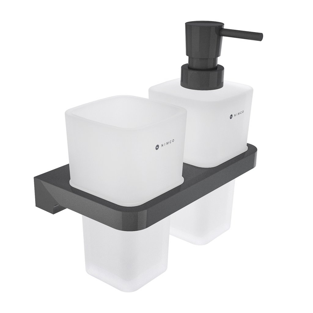 Dvojitý nástěnný držák na dávkovač mýdla a pohárek na zubní kartáčky z matného skla. Nádobky z matného skla v kombinaci s černým držákem perfektně ladí prostoru u umyvadla. Díky montáži na zeď je údržba umyvadla mnohem jednodušší. Dávkovač mýdla s mosaznou pumpičkou, povrchová úprava černá matná. Pro vyladěnou koupelnu doporučujeme i další produkty této designové řady.Dávkovač s pohárkem na kartáčky bude koupelně slušet mnohem více, pokud zvolíte i další doplňky série Maya černá z nabídky koupelnových a WC doplňků NIMCO.