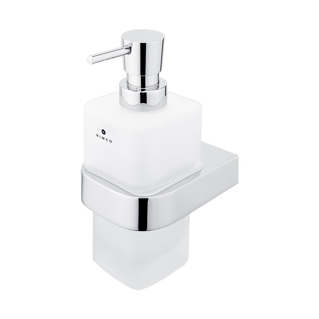 Nástěnný dávkovač tekutého mýdla hranatý, matné sklo a chrom, pumpa mosaz je skvělým doplňkem do koupelny.Dávkovač tekutého mýdla, pumpička mosaz bude koupelně slušet mnohem více, pokud zvolíte i další doplňky série Nikau z nabídky koupelnových a WC doplňků NIMCO.