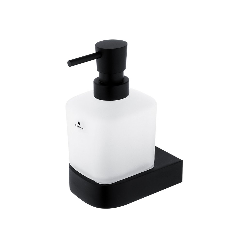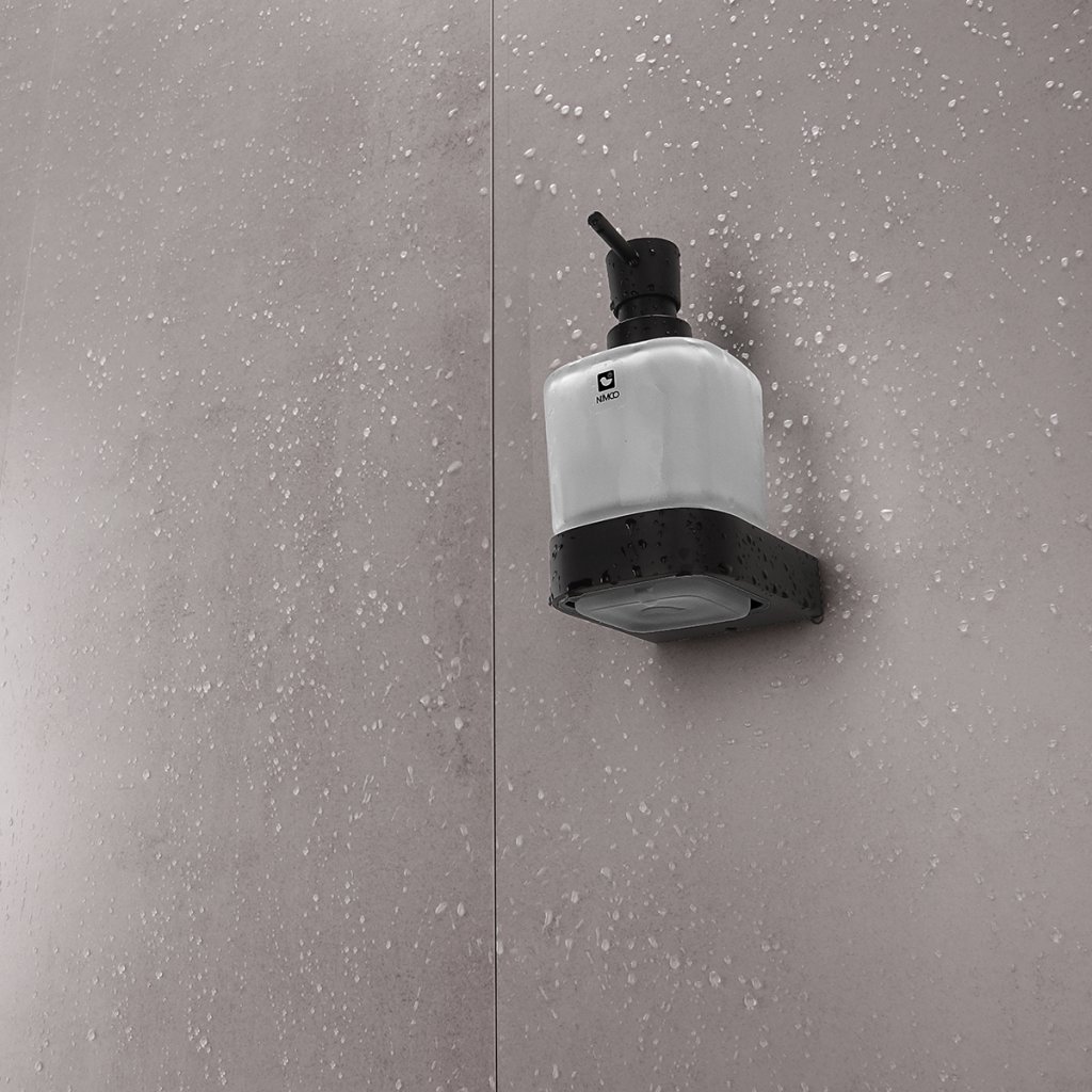 Nástěnný dávkovač tekutého mýdla matné sklo a černý kov, pumpa mosaz je skvělým doplňkem do koupelny.Dávkovač tekutého mýdla, pumpička mosaz bude koupelně slušet mnohem více, pokud zvolíte i další doplňky série Nikau černá z nabídky koupelnových a WC doplňků NIMCO.