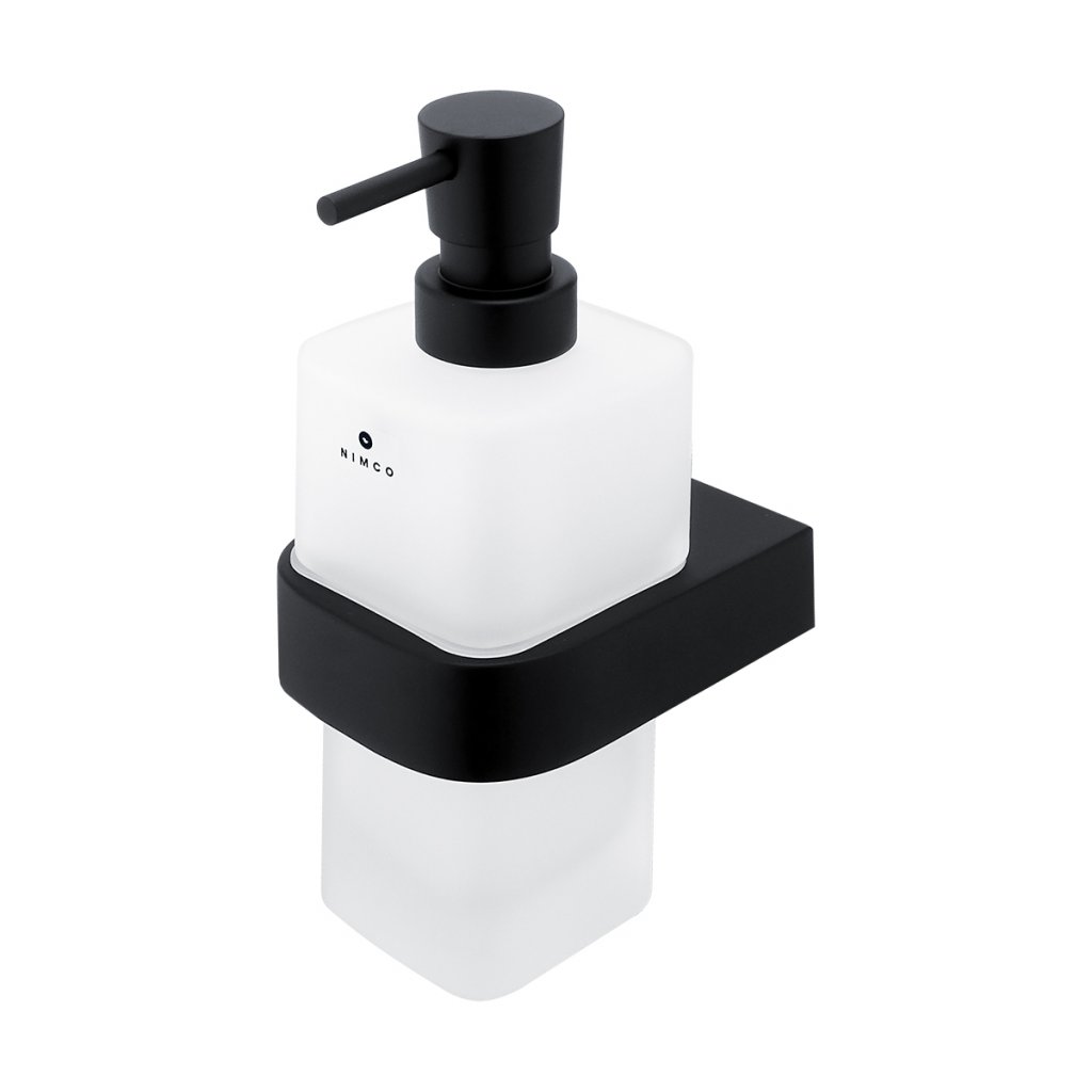 Nástěnný dávkovač tekutého mýdla matné sklo a černý kov, pumpa mosaz je skvělým doplňkem do koupelny.Dávkovač tekutého mýdla, pumpička mosaz bude koupelně slušet mnohem více, pokud zvolíte i další doplňky série Nikau černá z nabídky koupelnových a WC doplňků NIMCO.
