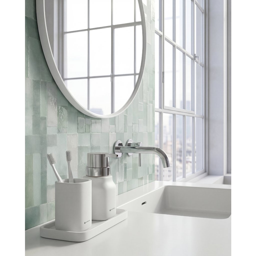Dávkovač mýdla lze doplnit také o další výrobky stejné designové řady, jako pohárek na zubní kartáčky.