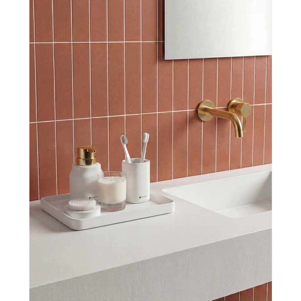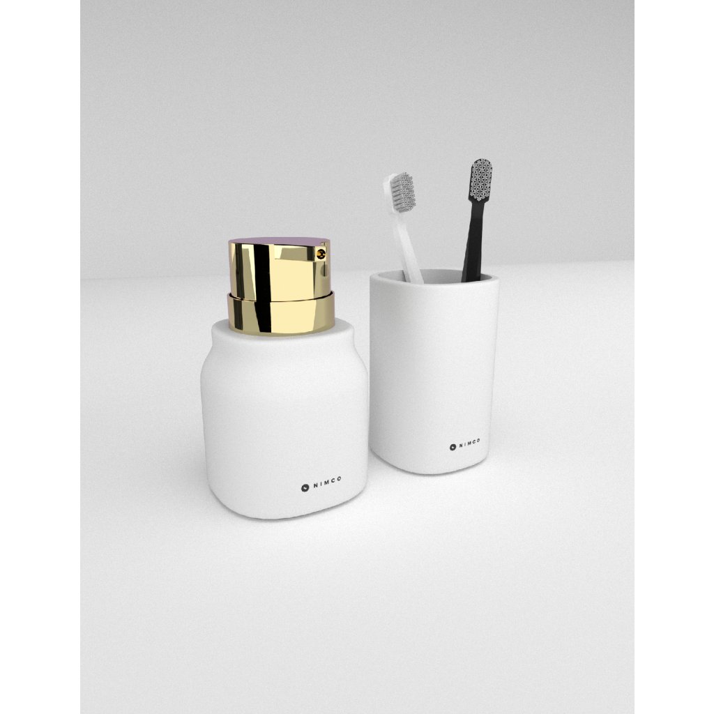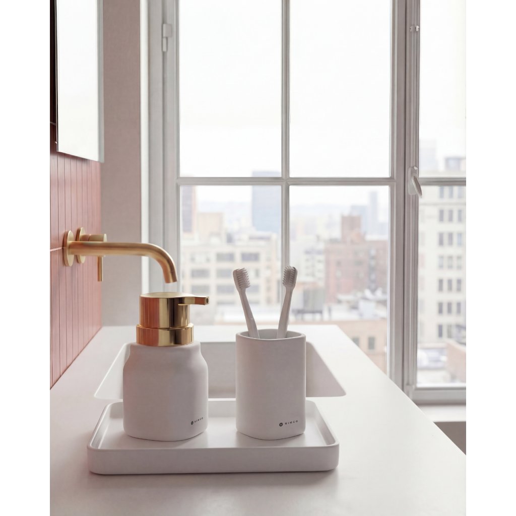 Dávkovač mýdla lze doplnit také o další výrobky stejné designové řady, jako pohárek na zubní kartáčky.