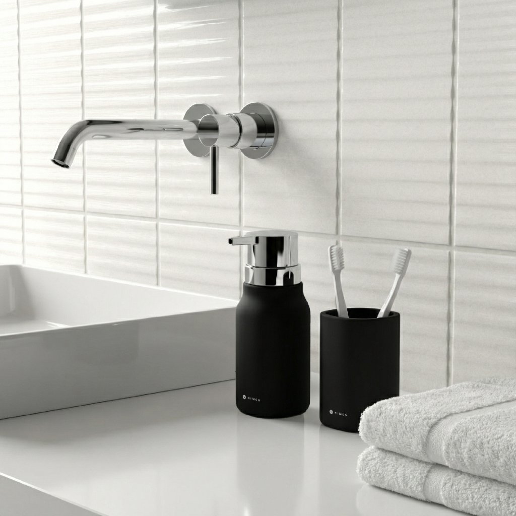 Dávkovač mýdla lze doplnit také o další výrobky stejné designové řady, jako pohárek na zubní kartáčky.