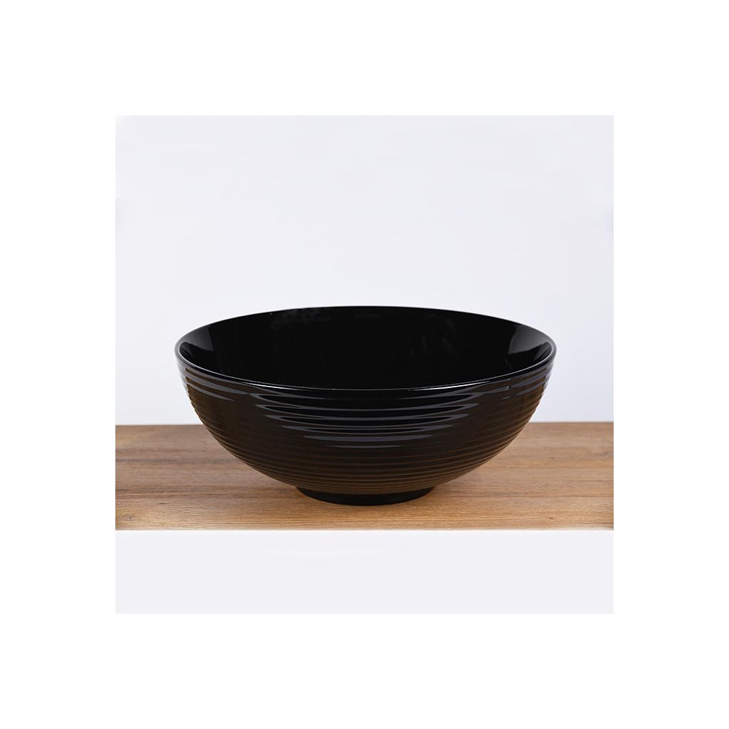Moderní kruhové umyvadlo na desku v elegantní černé lesklé barvě. Minimalistický jednoduchý styl umyvadla je doplněn vroubkováním po vnější straně. Malá kompaktní velikost umyvadla vhodně doplní vzhled velké, ale i malé koupelny.