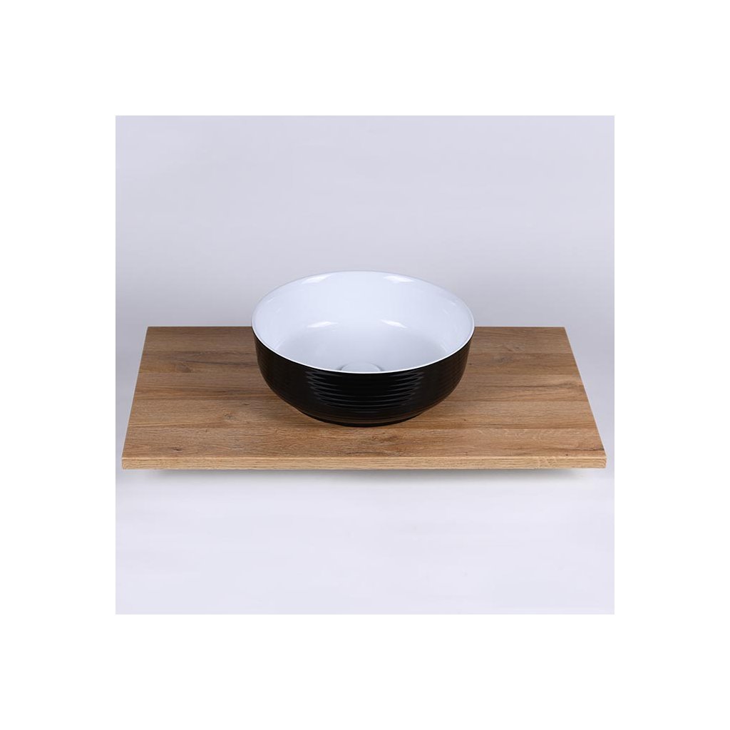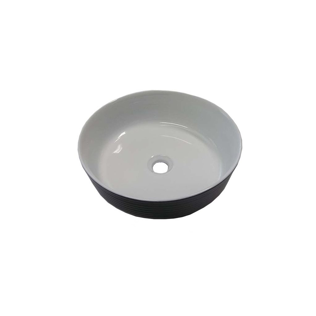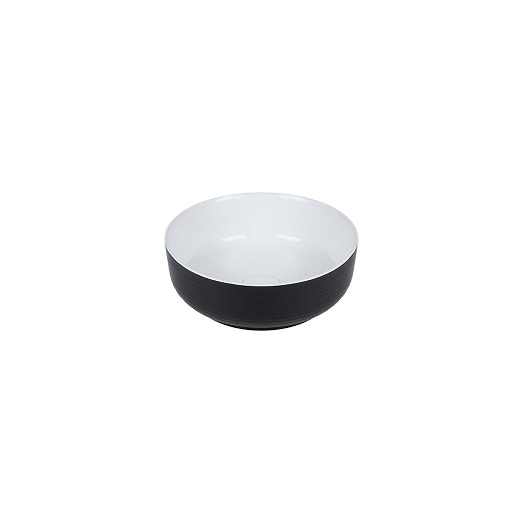 Moderní kruhové umyvadlo na desku v bílo černé kombinaci elegatně doplní každou koupelnu. Minimalistický jednoduchý styl umyvadla je doplněn jemným vroubkováním na vnější straně. Malá kompaktní velikost umyvadla vhodně doplní vzhled velké, ale i malé koupelny.