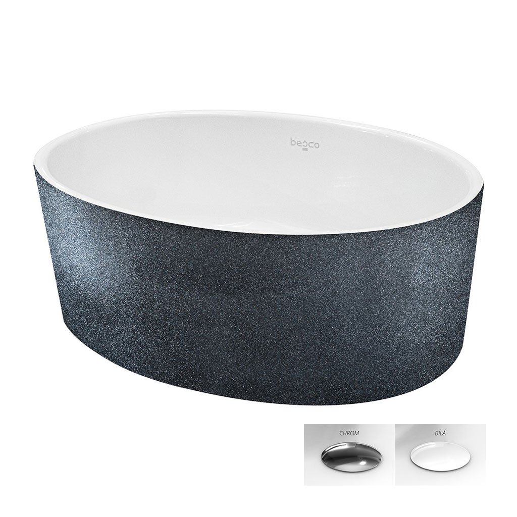 Moderní oválné umyvadlo z litého mramoru určené k ustavení na desku dodáváme v barevné kombinaci bílá lesk (povrch mycí komory) / grafit metalická, struktural (vnější plášť). Je doplněno o odtokovou výpusť typu Click-Clack v barvě chrom nebo bílá.