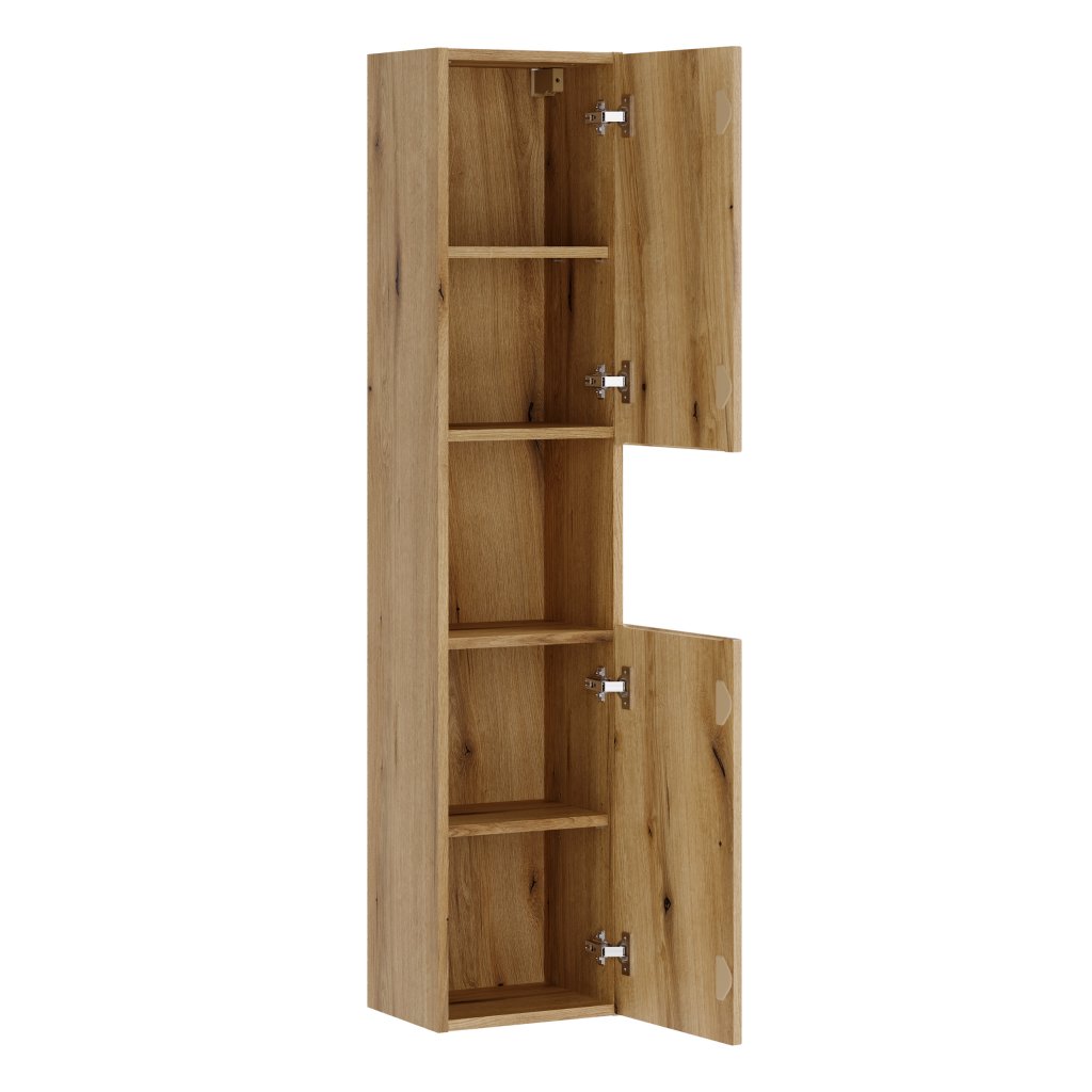 Vysoká dvoudveřová skříňka z kolekce Nova Coast Evoke je ztělesněním elegantního minimalismu a útulného designu. Teplý odstín a přirozená struktura dekoru dub Coast Evoke dodávají koupelně měkký a přívětivý charakter. Výrazným estetickým prvkem jsou svislé frézované drážky na čelních stranách, které v kombinaci s integrovanými madly (podhmaty) podtrhují nadčasový vzhled nábytku.