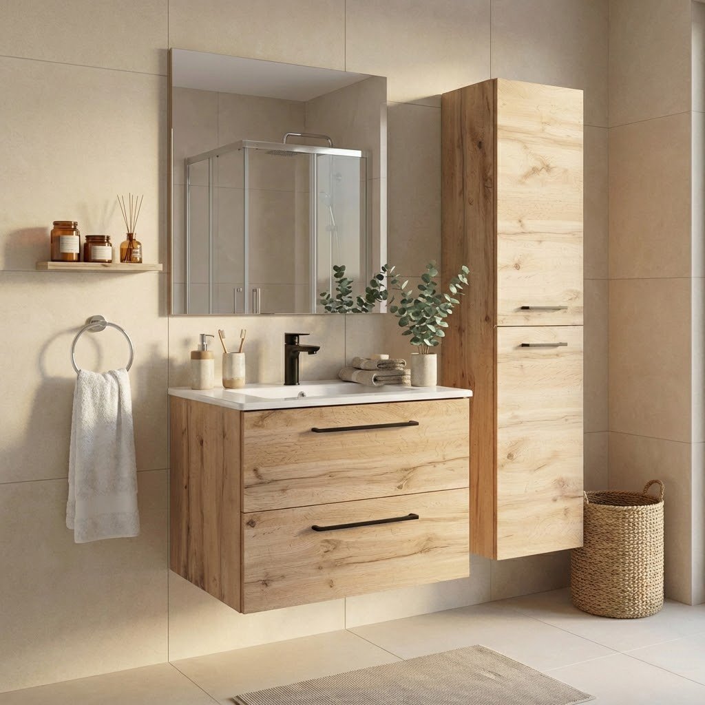 Série moderního nábytku Sorno v provedení korpusu a čelních ploch v dekoru dřeva. Tento nábytek bude bude dokonale plnit svou funkci v každé moderní koupelně. Základem této série je skříňka s keramickým umyvadlem v šířce 60 cm, která je doplněna zrcadlovou skříňkou bez osvětlení a doplňkovou skříňkou vysokou s množstvím úložného prostoru.