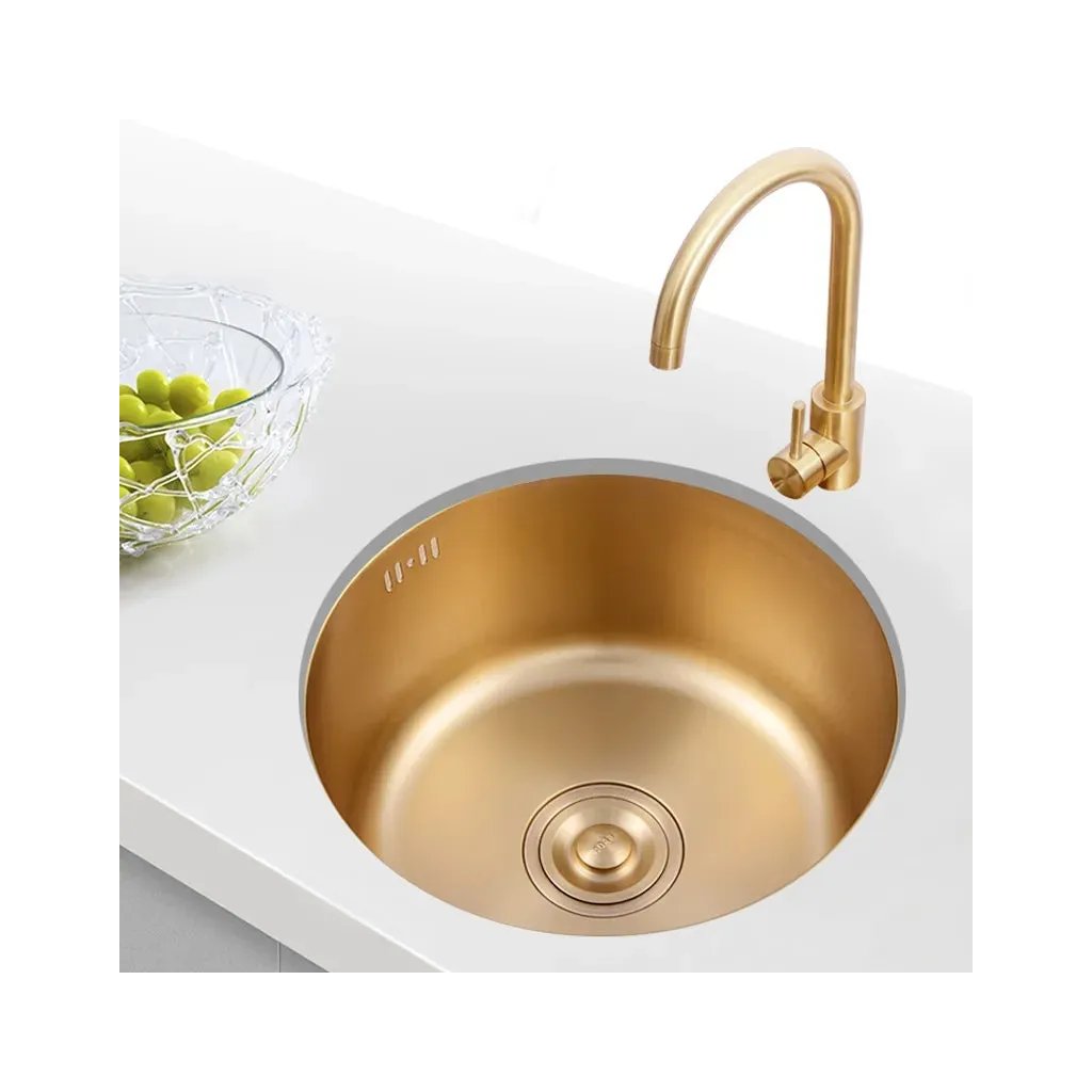 Kulatý kuchyňský 1-komorový dřez ve zlaté barvě s PVD povrchovou úpravou je dokonalým spojením stylu, praktičnosti a moderní estetiky. Vyroben z nerezové oceli typu 201, nabízí dostatečnou odolnost vůči běžnému zatížení v domácí kuchyni. Povrchová úprava pomocí technologie PVD (Physical Vapor Deposition) dodává dřezu nejen luxusní vzhled, ale i zvýšenou odolnost vůči opotřebení a korozi.