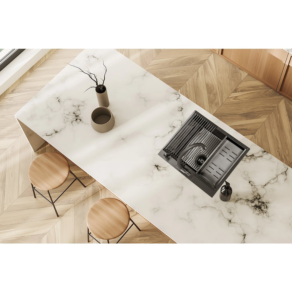 Dřez Malawi lze montovat jako zapuštěný do pracovní desky nebo v rovině s deskou pro dosažení čisté, harmonické linie kuchyňské plochy.