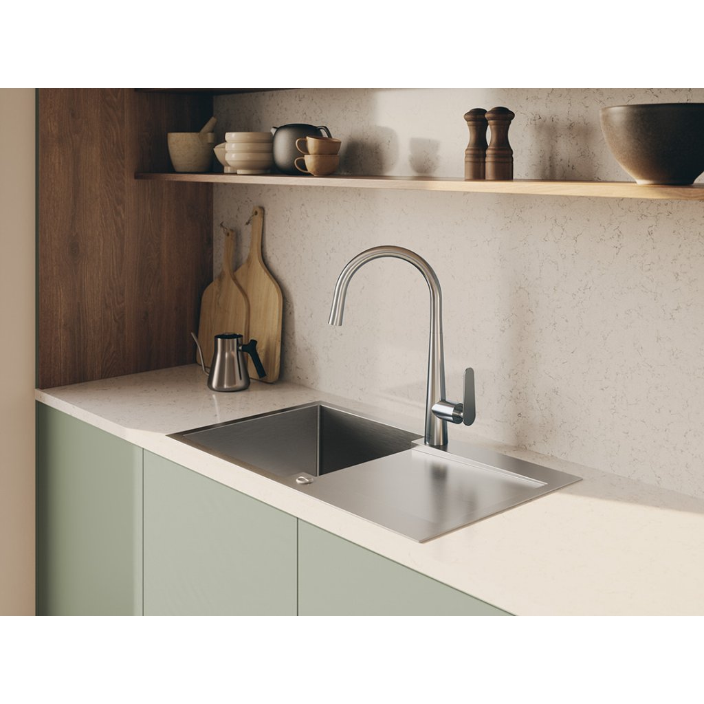 Typickým rysem série je malý poloměr rohů komory, který nejen podtrhuje moderní styl, ale také usnadňuje čištění. Prostorná a hluboká mycí komora umožňuje pohodlné mytí velkých nádob, včetně plechů z trouby, což ocení každý, kdo v kuchyni často vaří. Praktickým doplňkem je pak dokonale funční odkládací a odkapávací plocha. Díky své konstrukci lze dřez instalovat s odkapávačem na pravé nebo levé straně.