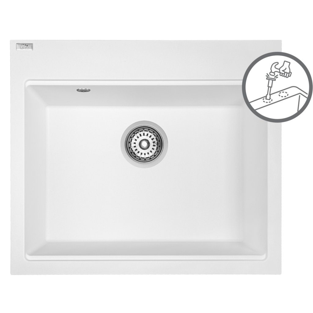 Model Tau je dodáván se třemi předvrtanými otvory pro montáž baterie a ostatních doplňků - otvor si můžete snadno vytvořit sami v jednom z připravených podfrézovaných míst podle vašich preferencí a rozvržení kuchyňské linky. Součástí balení je také odtoková výpusť s uzavíráním typu Click-Clack a sifon Space Saving, který šetří místo v kuchyňské skříňce.