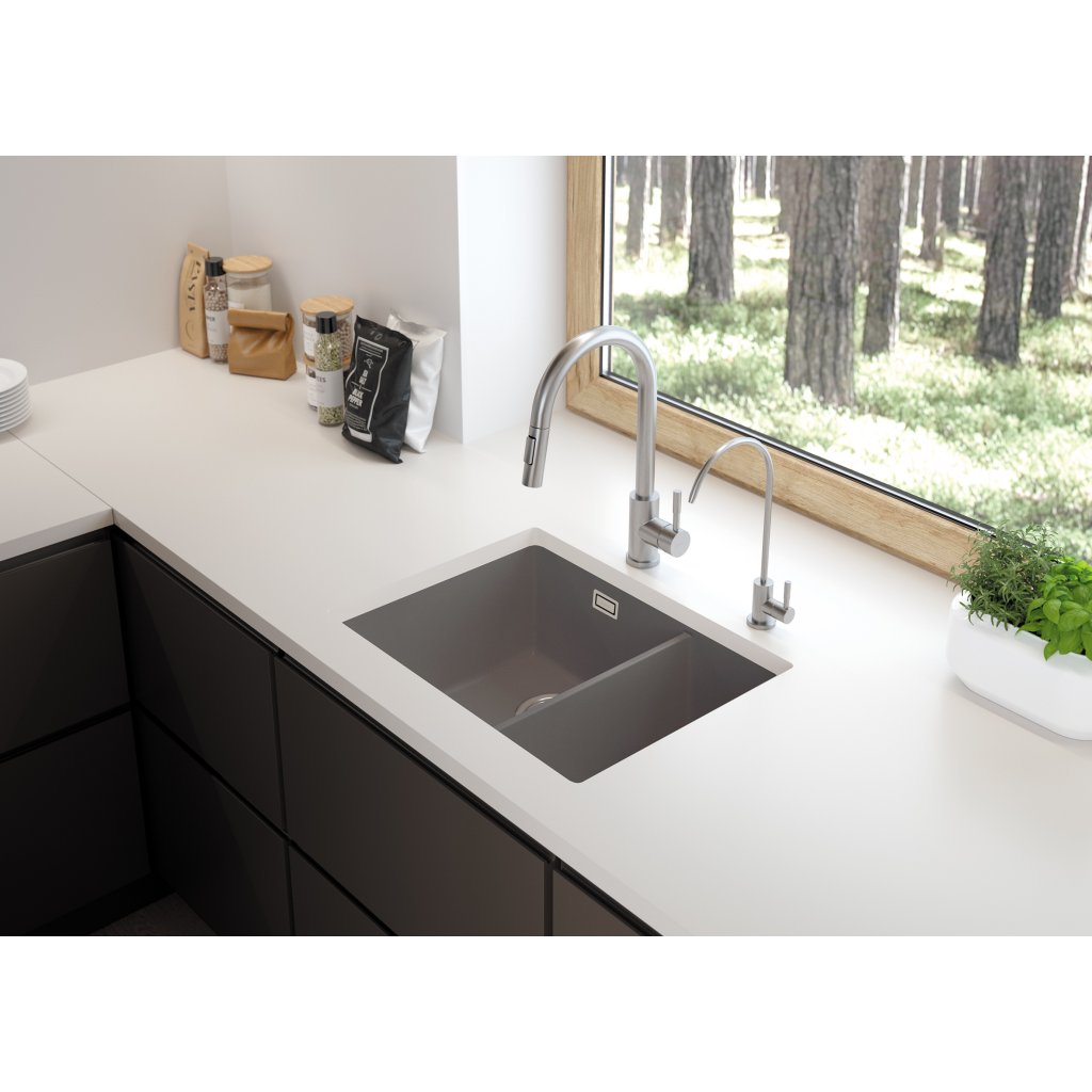 Granitový 1,5 komorový dřez Eridan je klasický a přitom velmi funkční výrobek, který se bude hodit v kuchyních uspořádaných prakticky v jakémkoli stylu - klasickém i moderním. Granitový povrch v souladu s normou EN 13310 je odolný proti oděru, změně barvy, vysoké teplotě a nárazům. Také odpuzuje kapalné částice, díky čemuž zbytky vody, nápojů jako džusy, káva nebo čaj rychleji stékají. Granitový povrch také neabsorbuje pachy a je odolný vůči teplotním šokům. 1,5 komorové provedení je praktickým kompromisem mezi velkým, dvoukomorovým dřezem a menším jednokomorovým dřezem. Umožní oddělit vybrané nádobí od sebe nebo pohodlně rozmrazovat potraviny. Dřez Eridan s vykrouženým otvorem pro baterii, obdélníkovým přepadem ve velké komoře a automatickým uzávěrem výpusti lze jak zapustit do desky tak zavěsit. Sifon Spacesaver obsažený v sadě s možností připojení k myčce byl navržen tak, aby zabíral až o 50 % méně místa než standardní sifony. Dřez má předpřipravené otvory pro dávkovač mýdla či ovladač automatického odpadu.Vlastnosti granitu Deante: odolnost proti nárazu, vysoké teplotě, změně barvy, tepelnému šoku