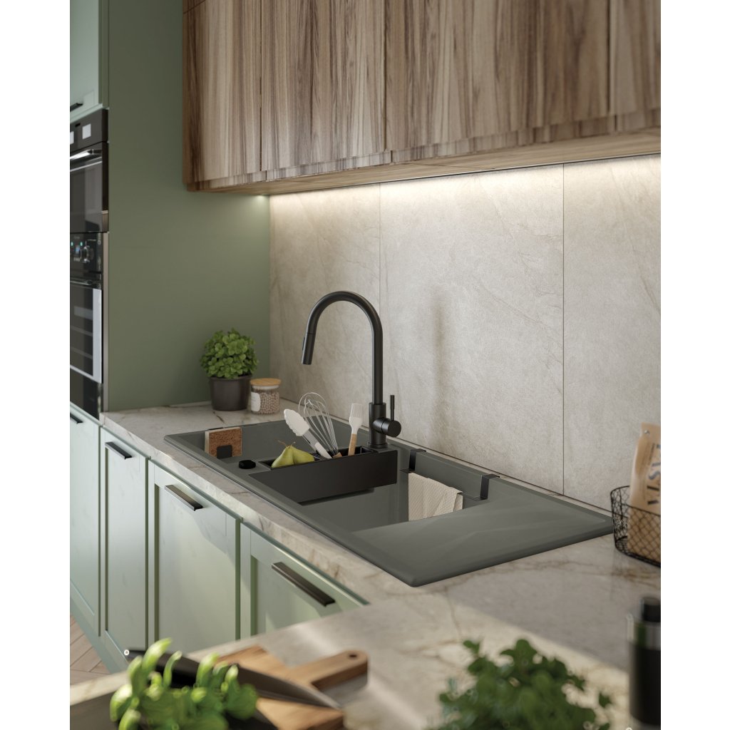 Dřez je vybaven inovativním sifonem "Space Saver". Pokud Vás trápila kolena a trubky zabírající celý prostor ve skříňce, toto je řešení pro vaši kuchyni. Teleskopická konstrukce a speciální design umožňují přizpůsobení sifonu potřebám. Díky tomu je snadné najít ve skříni mnohem více místa, které lze využít pro koše na třídění odpadu. K sifonu je možné připojit i pračku nebo myčku. A hlavně – sifon je součástí!
