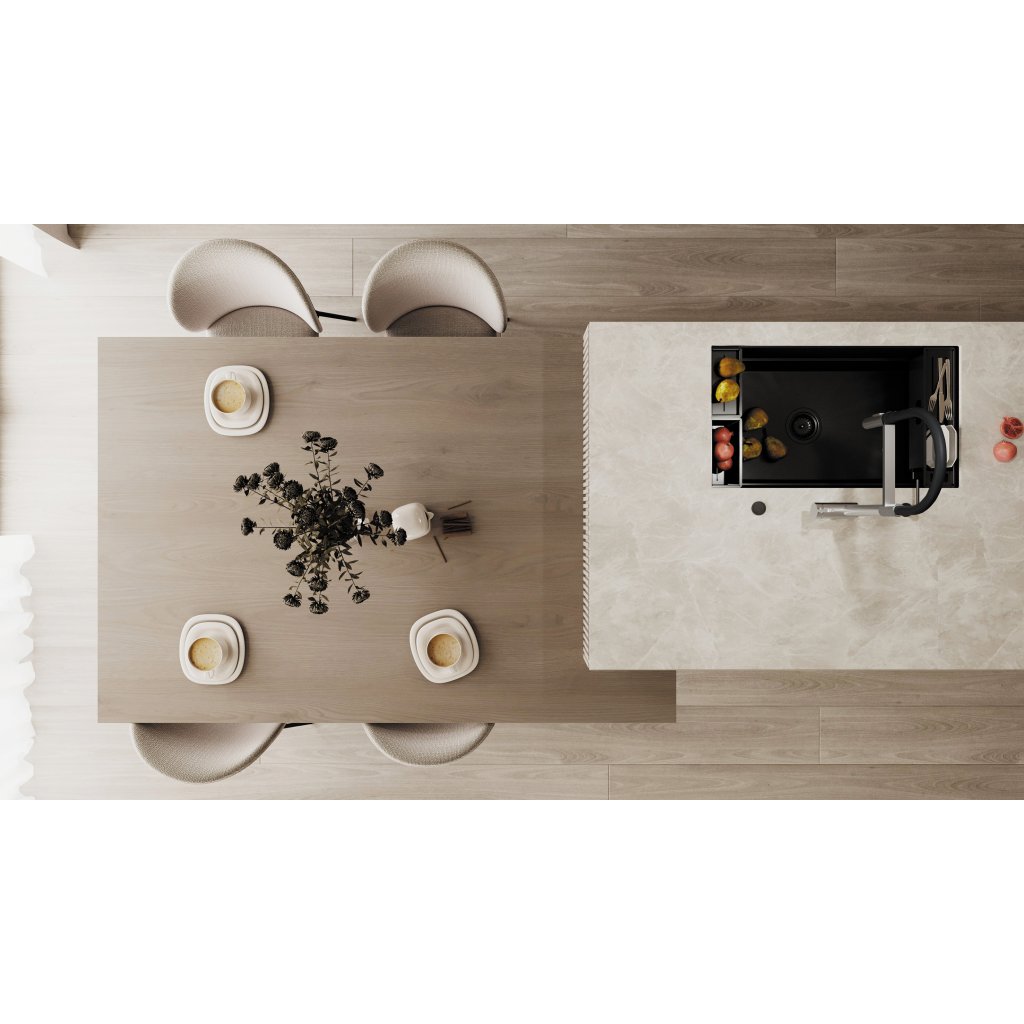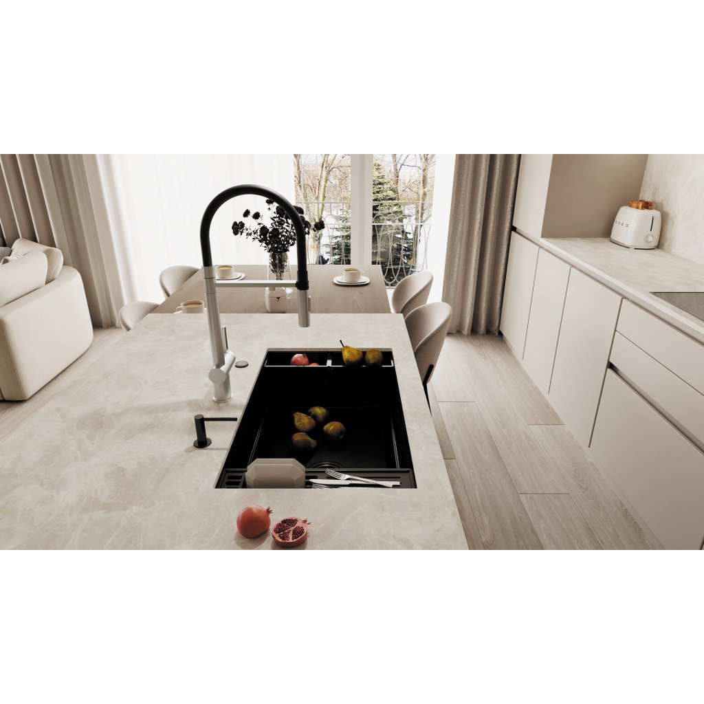 Kuchyňská baterie Magnetic je příkladem dokonalého spojení funkčnosti a moderního designu. Flexibilní hubice s magnetickou rukojetí zajišťuje pohodlí a přesnost, takže je snadné hubici rychle vrátit na místo. Řešení, jako je připojení vodního filtru nebo dvoufunkční sprška s možností deště nebo provzdušněného proudu, činí z baterie Magnetic všestranně použitelný produkt. Povrchová úprava z broušené oceli ji dodává jemný, moderní charakter, který se perfektně hodí do minimalistických a industriálních interiérů. Výrobek dokonale funguje s magnetickými dřezy ze stejné modelové řady, což zajišťuje estetiku a konzistenci.