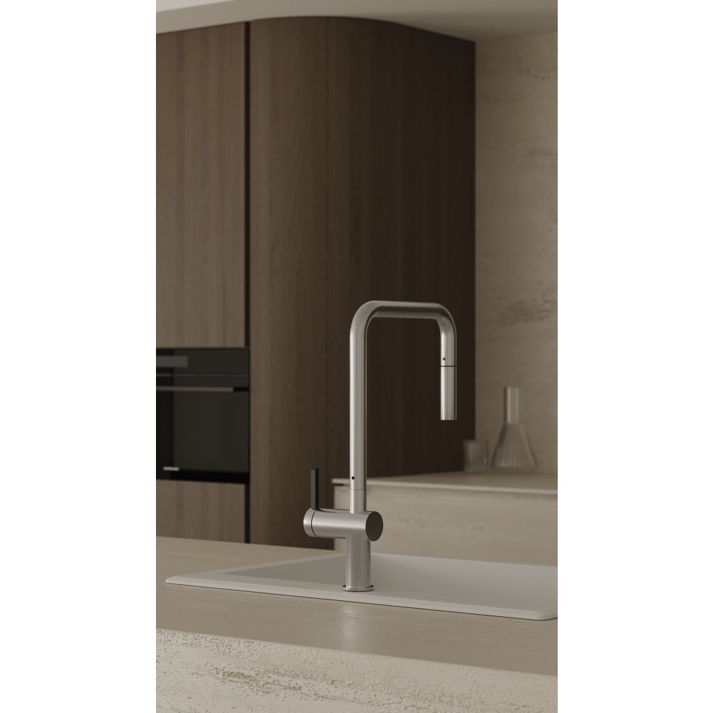 Baterie Momi, vyrobená z vysoce kvalitní nerezové oceli, spojuje estetiku a funkčnost. Integrovaný perlátor účinně provzdušňuje proud vody a zároveň snižuje spotřebu vody. Výsuvná hubice zajišťuje pohodlí při každodenních činnostech v kuchyni, umožňuje snadné nasměrování proudu i při mytí většího nádobí nebo těžko dostupných míst. Sluchátko navíc nabízí dva režimy proudu vody: jemně provzdušňovaný, ideální pro standardní mytí, a proud deště, ideální pro oplachování zeleniny a ovoce. Baterie Momi je vynikající volbou do současných kuchyní, nabízí nejen stylový vzhled, ale také výjimečný komfort používání.Baterie je vybavena zpětnými ventily, díky kterým namíchaná voda nestéká zpět do instalace