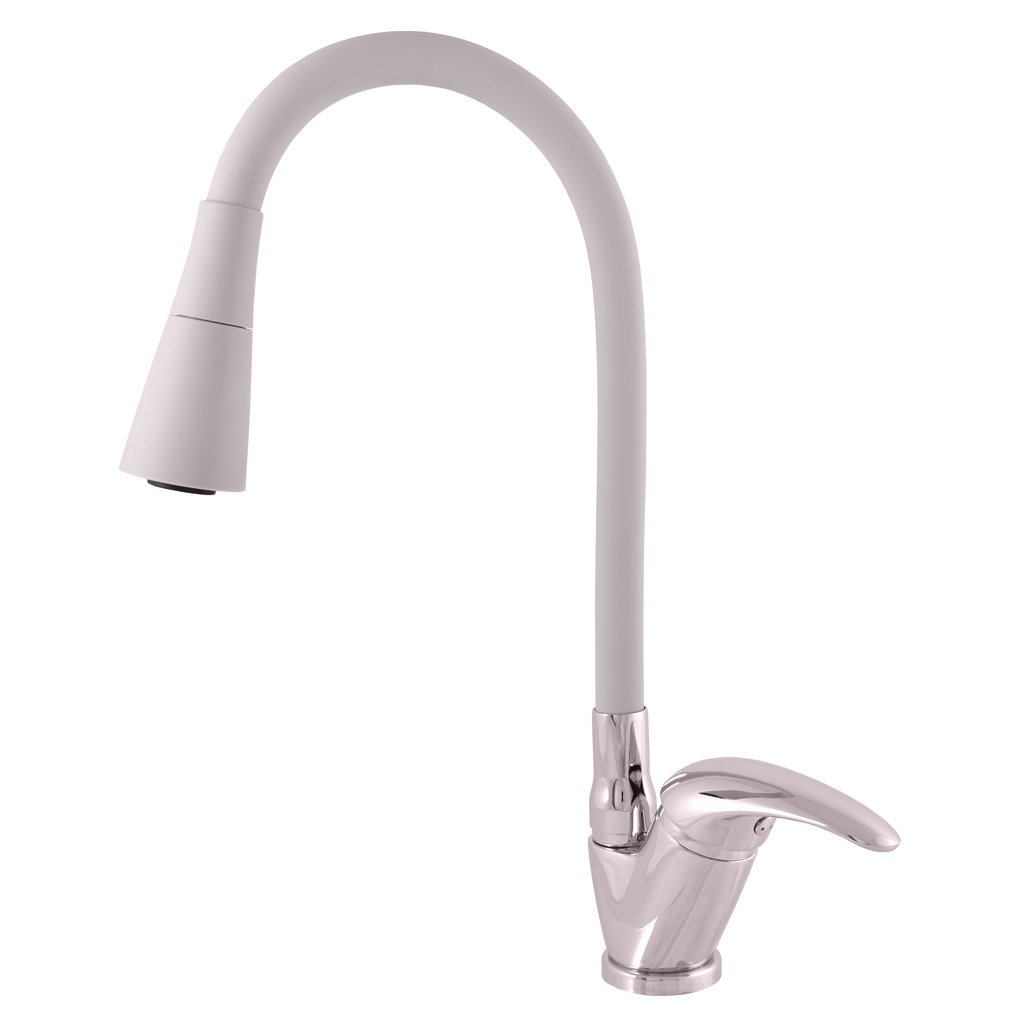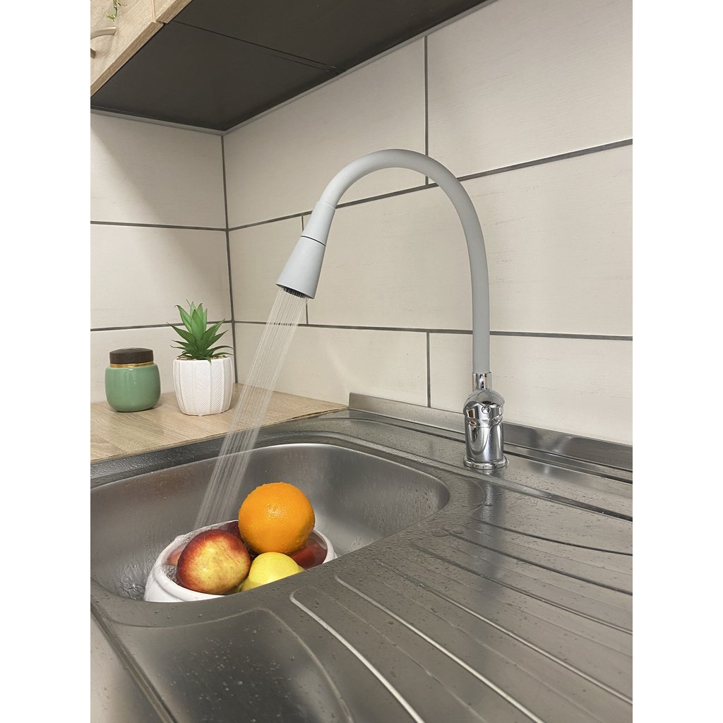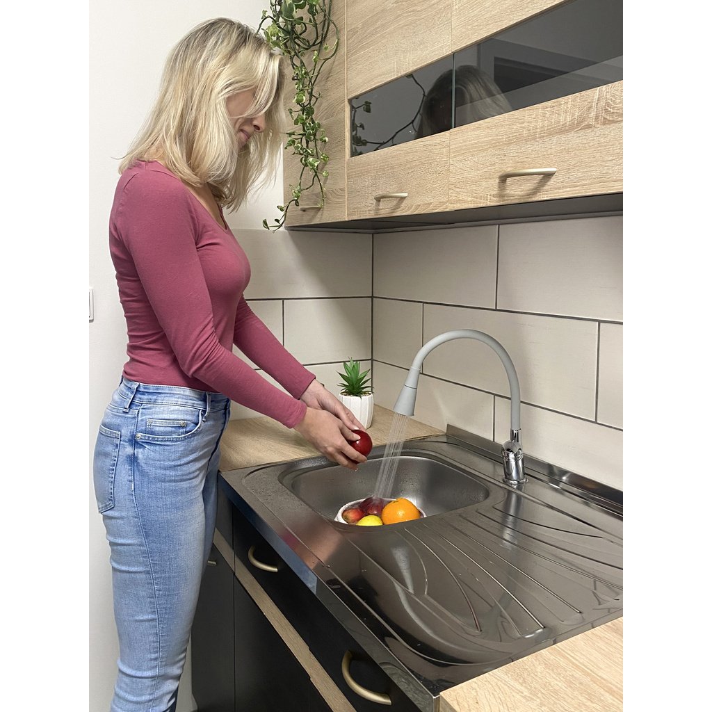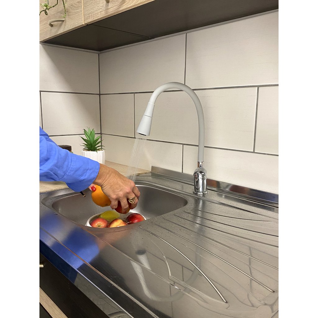 Vodovodní baterie dřezová stojánková s flexibilním otočným ramínkem se sprchou.