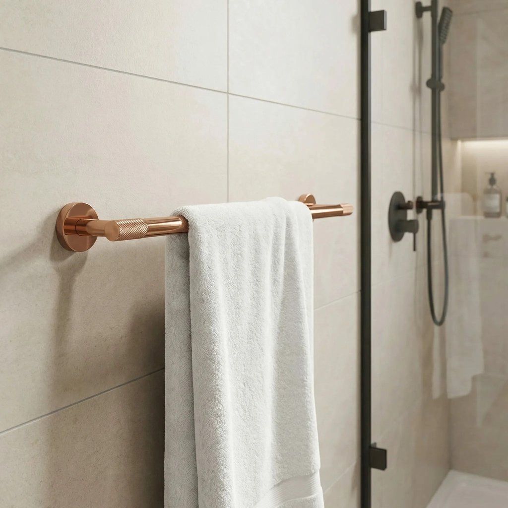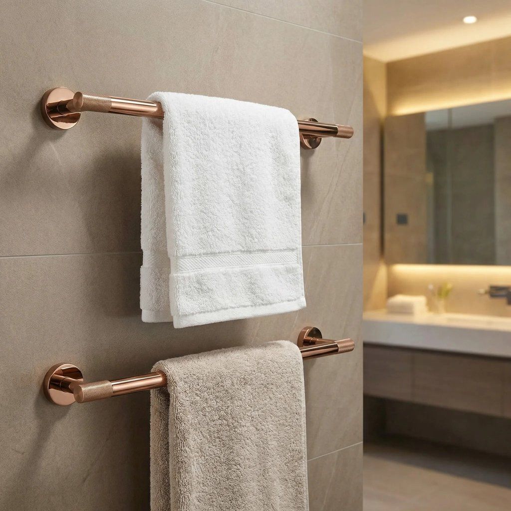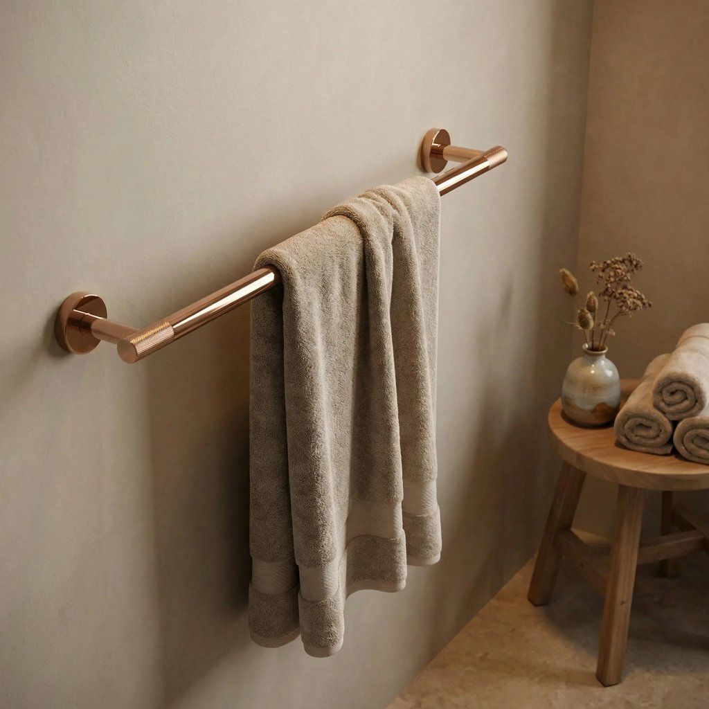 Zajistěte si dokonalý pořádek a minimalistický styl ve své koupelně s věšákem na ručníky ze série Modern. Tento doplněk v hřejivém odstínu mědi představuje ideální spojení elegance a praktického využití, které harmonicky doplní moderní sanitární armaturu. Věšák je vyroben z vysoce kvalitního kovu, což zaručuje jeho naprostou odolnost proti korozi a mechanickému opotřebení. Solidní konstrukce je navržena tak, aby spolehlivě sloužila po dlouhá léta i v náročném vlhkém prostředí koupelny.