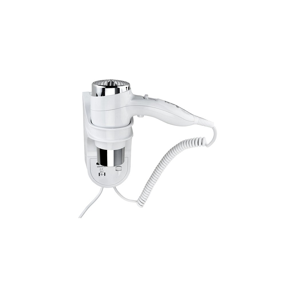 Nástěnný hotelový fén bílý s držákem a spirálovou šňůrou (600-1600 mm). K dispozici dvě rychlosti foukání a tři teploty vzduchu. Výkon 630-1600 W. Součástí nástěnného držáku je el. zásuvka.Fén se připojuje do el. zásuvky pomocí kabelu se vidlicovou zástrčkou.