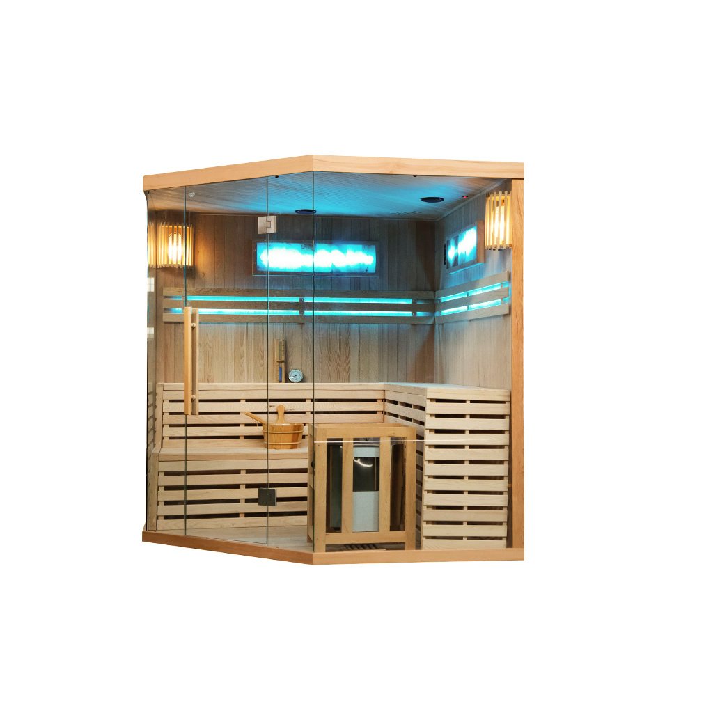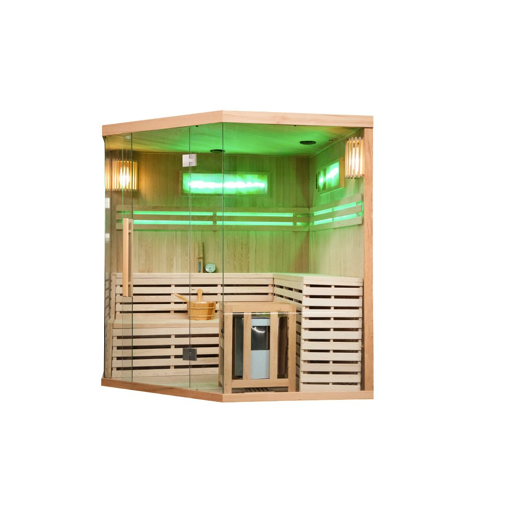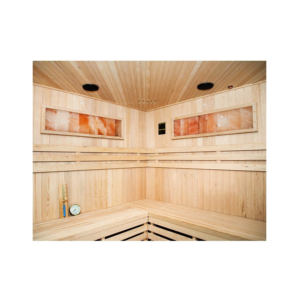 Tradiční finská sauna, známá také jako suchá sauna, je místo, kde teplota vzduchu dosahuje 60 až 85 stupňů Celsia a vlhkost vzduchu se pohybuje mezi 5-15 %. Dosažení tak vysoké teploty je možné díky speciálnímu vařiči, který zahřívá kameny. Interiér kabiny je obohacen o pohodlná sedadla z kanadského jedlového dřeva. Používání tradiční sauny přináší mnoho výhod pro naši pohodu a zdraví. Již po několika sezeních pocítíte vnitřní teplo, které má pozitivní vliv na vaše tělo i mysl. Pravidelné návštěvy sauny stimulují biologické změny v těle, které jsou nezbytné pro udržení homeostázy a psychofyzické rovnováhy. Jedním z klíčových léčebných účinků finské sauny je lipolýza - proces odbourávání triglyceridů a lipidů tukových buněk. Tato účinná terapie bojuje proti celulitidě a pomáhá zpevňovat tělo. Prohřívání těla v sauně zrychluje krevní oběh, což napomáhá vylučování toxinů z těla a zlepšuje celkový stav pokožky. Kromě blahodárných účinků na tělo má tradiční finská sauna pozitivní vliv také na naši mysl. Relaxační a uklidňující klima nám umožňuje oprostit se od každodenního stresu a napětí, což následně přispívá k celkovému pocitu lepší pohody a uvolnění. Tradiční finská sauna je nejen místem, kde můžete pocítit fyzické teplo, ale také objevit její přínos pro zdraví a pohodu těla i mysli. Díky svému účinku na tělo, terapeutické síle a relaxačnímu charakteru je jedním z nejoblíbenějších a nejoceňovanějších míst ve finské kultuře i ve světě. Sauna je navíc vybavena 2 velkými solnými lampami, které navozují jedinečnou atmosféru a mají léčebný účinek na dýchací cesty a pokožku.
