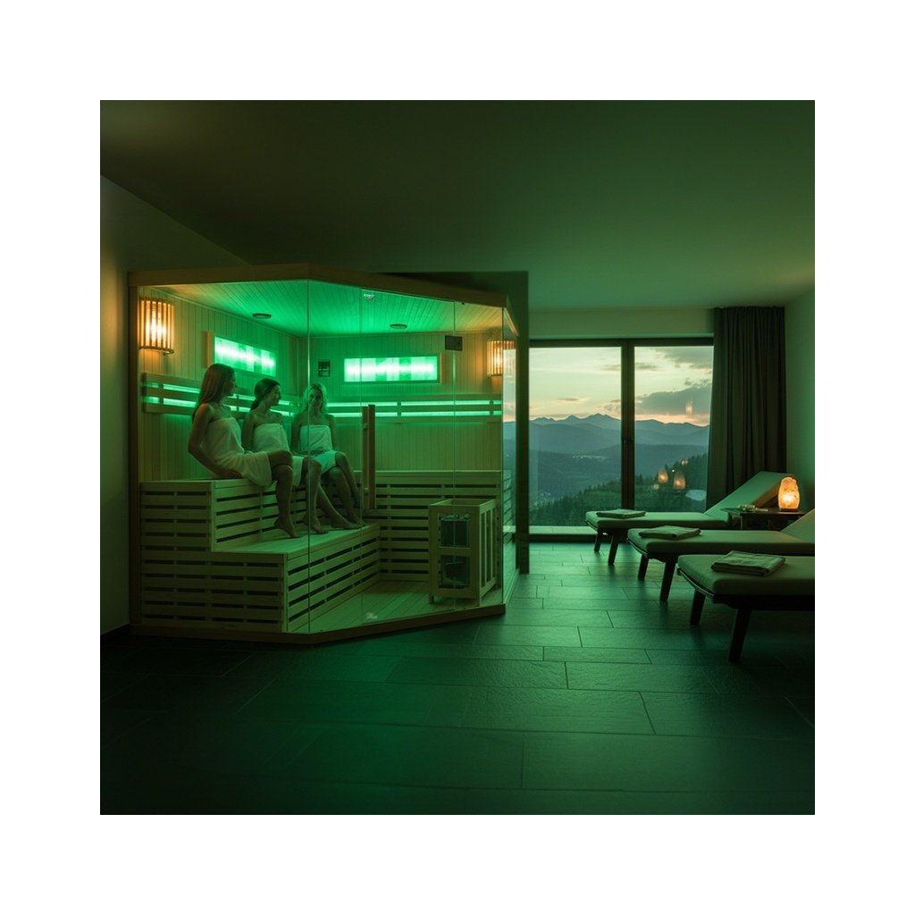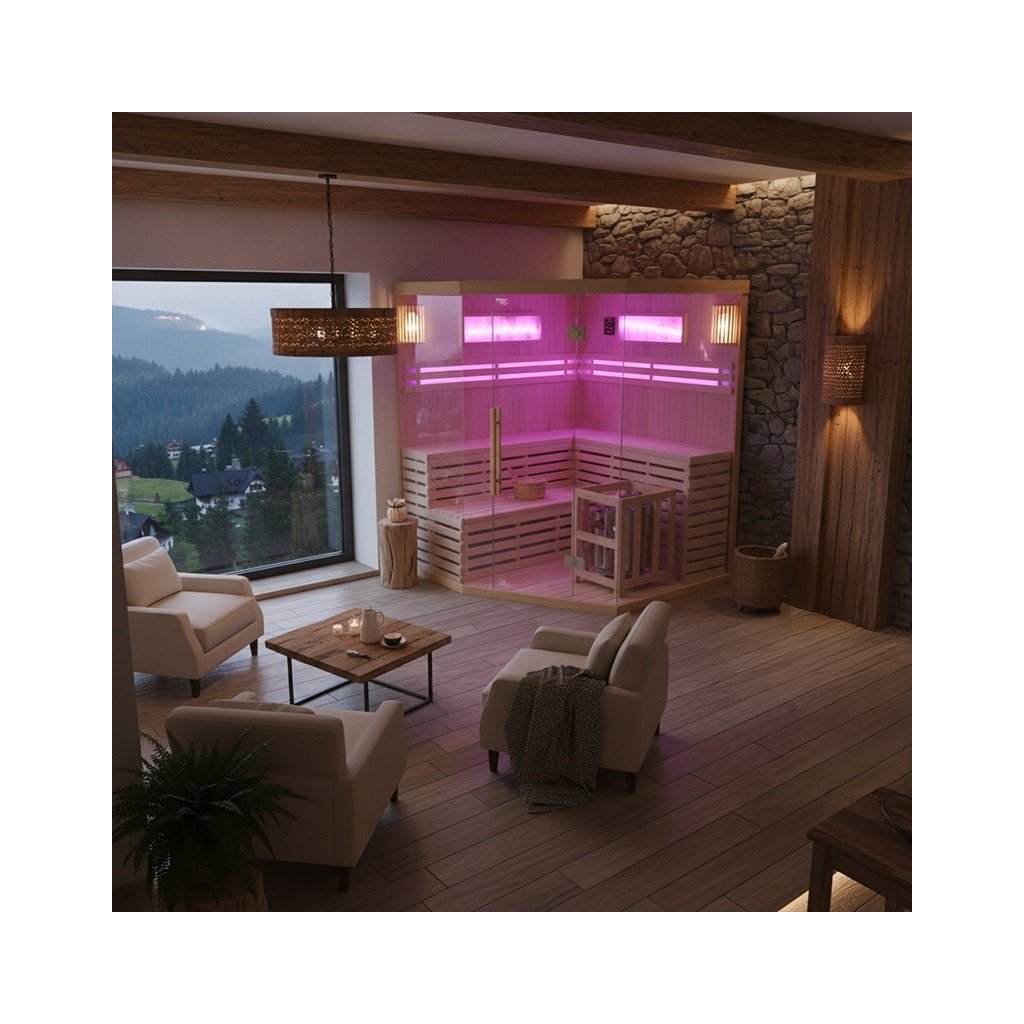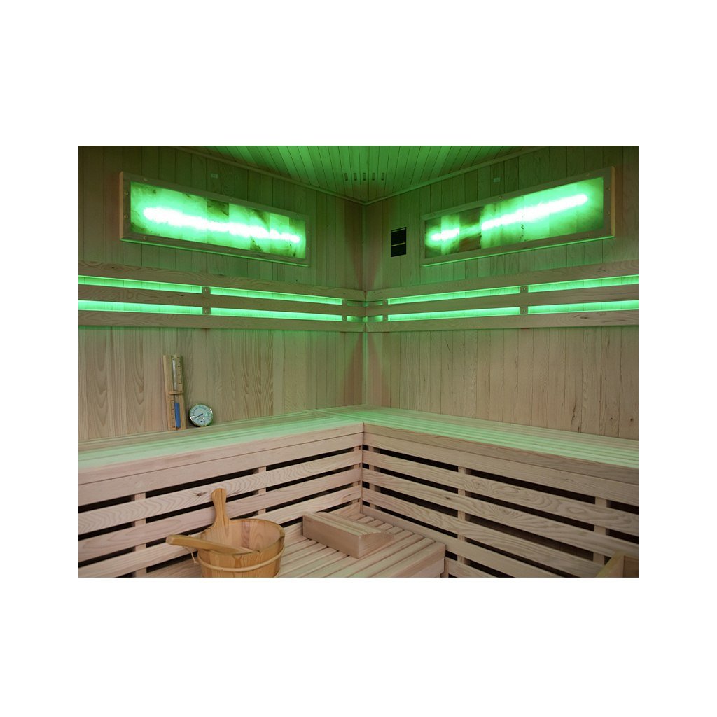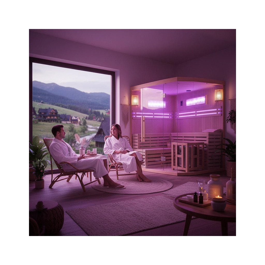 Tradiční finská sauna, známá také jako suchá sauna, je místo, kde teplota vzduchu dosahuje 60 až 85 stupňů Celsia a vlhkost vzduchu se pohybuje mezi 5-15 %. Dosažení tak vysoké teploty je možné díky speciálnímu vařiči, který zahřívá kameny. Interiér kabiny je obohacen o pohodlná sedadla z kanadského jedlového dřeva. Používání tradiční sauny přináší mnoho výhod pro naši pohodu a zdraví. Již po několika sezeních pocítíte vnitřní teplo, které má pozitivní vliv na vaše tělo i mysl. Pravidelné návštěvy sauny stimulují biologické změny v těle, které jsou nezbytné pro udržení homeostázy a psychofyzické rovnováhy. Jedním z klíčových léčebných účinků finské sauny je lipolýza - proces odbourávání triglyceridů a lipidů tukových buněk. Tato účinná terapie bojuje proti celulitidě a pomáhá zpevňovat tělo. Prohřívání těla v sauně zrychluje krevní oběh, což napomáhá vylučování toxinů z těla a zlepšuje celkový stav pokožky. Kromě blahodárných účinků na tělo má tradiční finská sauna pozitivní vliv také na naši mysl. Relaxační a uklidňující klima nám umožňuje oprostit se od každodenního stresu a napětí, což následně přispívá k celkovému pocitu lepší pohody a uvolnění. Tradiční finská sauna je nejen místem, kde můžete pocítit fyzické teplo, ale také objevit její přínos pro zdraví a pohodu těla i mysli. Díky svému účinku na tělo, terapeutické síle a relaxačnímu charakteru je jedním z nejoblíbenějších a nejoceňovanějších míst ve finské kultuře i ve světě. Sauna je navíc vybavena 2 velkými solnými lampami, které navozují jedinečnou atmosféru a mají léčebný účinek na dýchací cesty a pokožku.