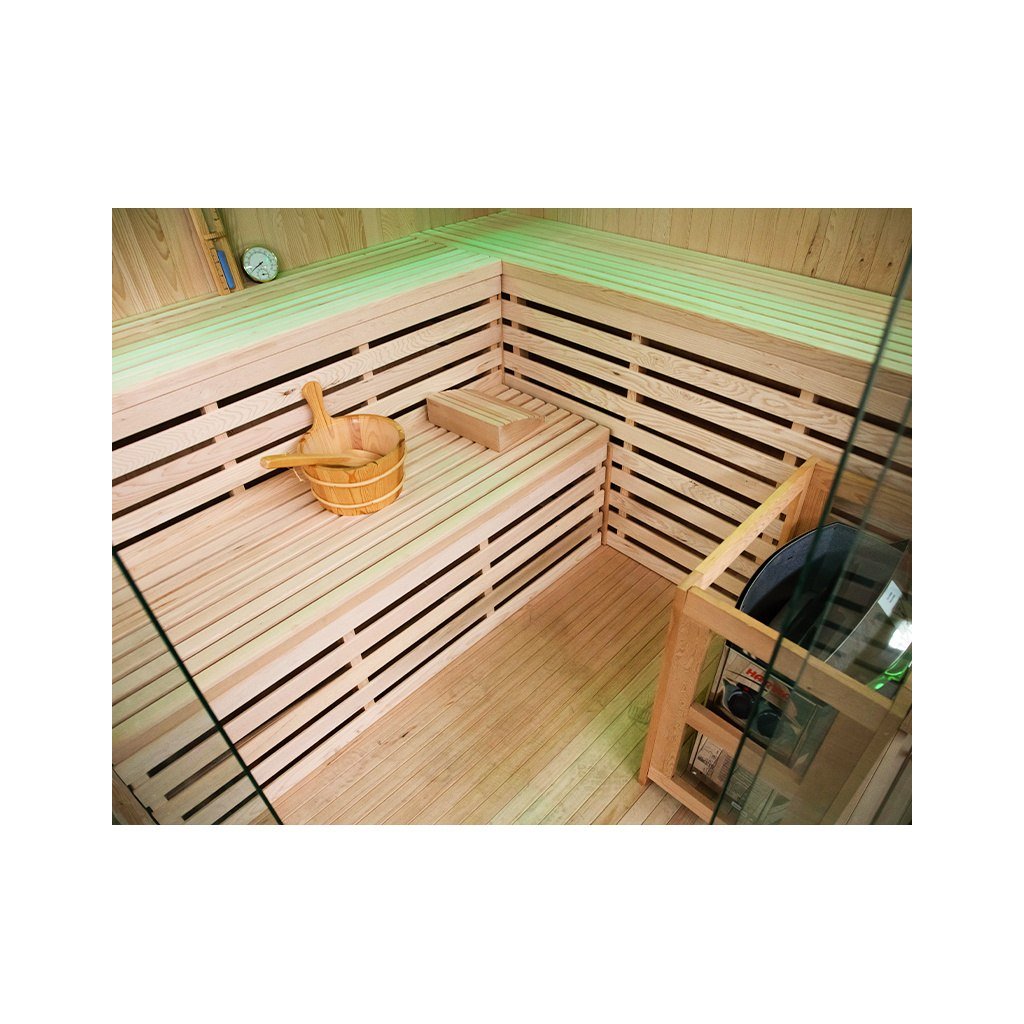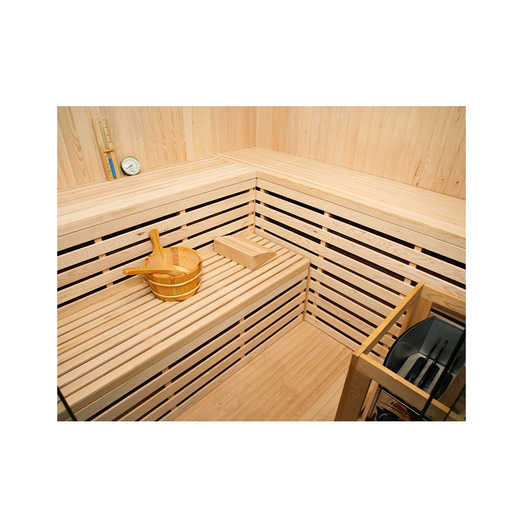 - Sauna je vyrobena z Kanadského jedlovce - Hemlock. Jedná se o nejideálnější materiál pro výrobu saun. Dřevo Hemlock neobsahuje pryskyřici a nevypouští žádné vůně.