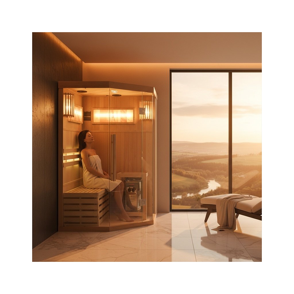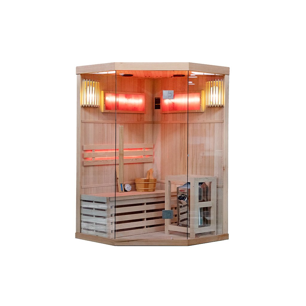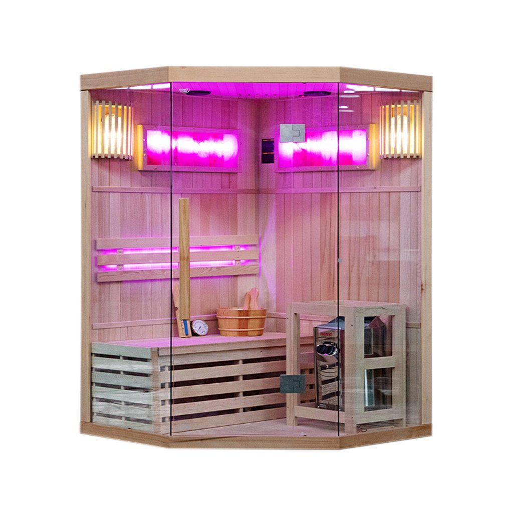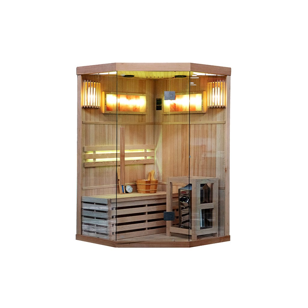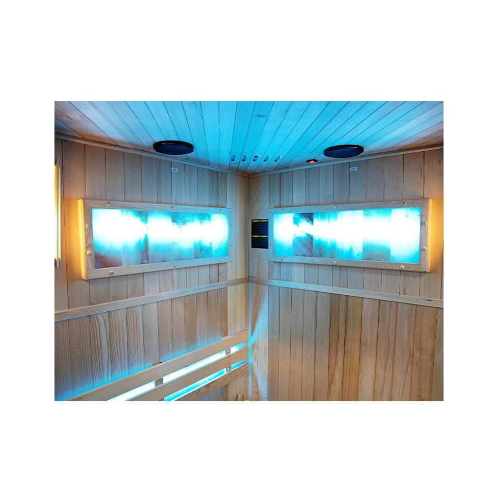 Tradiční finská sauna, známá také jako suchá sauna, je místo, kde teplota vzduchu dosahuje 60 až 85 stupňů Celsia a vlhkost vzduchu se pohybuje mezi 5-15 %. Dosažení tak vysoké teploty je možné díky speciálnímu vařiči, který zahřívá kameny. Interiér kabiny je obohacen o pohodlná sedadla z kanadského jedlového dřeva. Používání tradiční sauny přináší mnoho výhod pro naši pohodu a zdraví. Již po několika sezeních pocítíte vnitřní teplo, které má pozitivní vliv na vaše tělo i mysl. Pravidelné návštěvy sauny stimulují biologické změny v těle, které jsou nezbytné pro udržení homeostázy a psychofyzické rovnováhy. Jedním z klíčových léčebných účinků finské sauny je lipolýza - proces odbourávání triglyceridů a lipidů tukových buněk. Tato účinná terapie bojuje proti celulitidě a pomáhá zpevňovat tělo. Prohřívání těla v sauně zrychluje krevní oběh, což napomáhá vylučování toxinů z těla a zlepšuje celkový stav pokožky. Kromě blahodárných účinků na tělo má tradiční finská sauna pozitivní vliv také na naši mysl. Relaxační a uklidňující klima nám umožňuje oprostit se od každodenního stresu a napětí, což následně přispívá k celkovému pocitu lepší pohody a uvolnění. Tradiční finská sauna je nejen místem, kde můžete pocítit fyzické teplo, ale také objevit její přínos pro zdraví a pohodu těla i mysli. Díky svému účinku na tělo, terapeutické síle a relaxačnímu charakteru je jedním z nejoblíbenějších a nejoceňovanějších míst ve finské kultuře i ve světě. Sauna je navíc vybavena 2 velkými solnými lampami, které navozují jedinečnou atmosféru a mají léčebný účinek na dýchací cesty a pokožku.