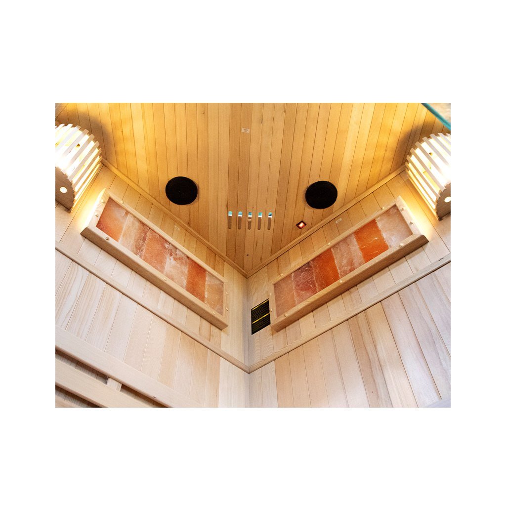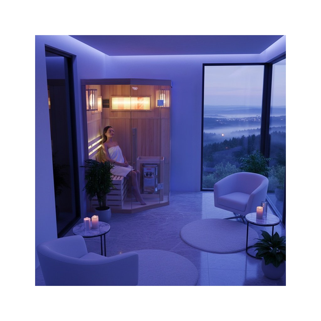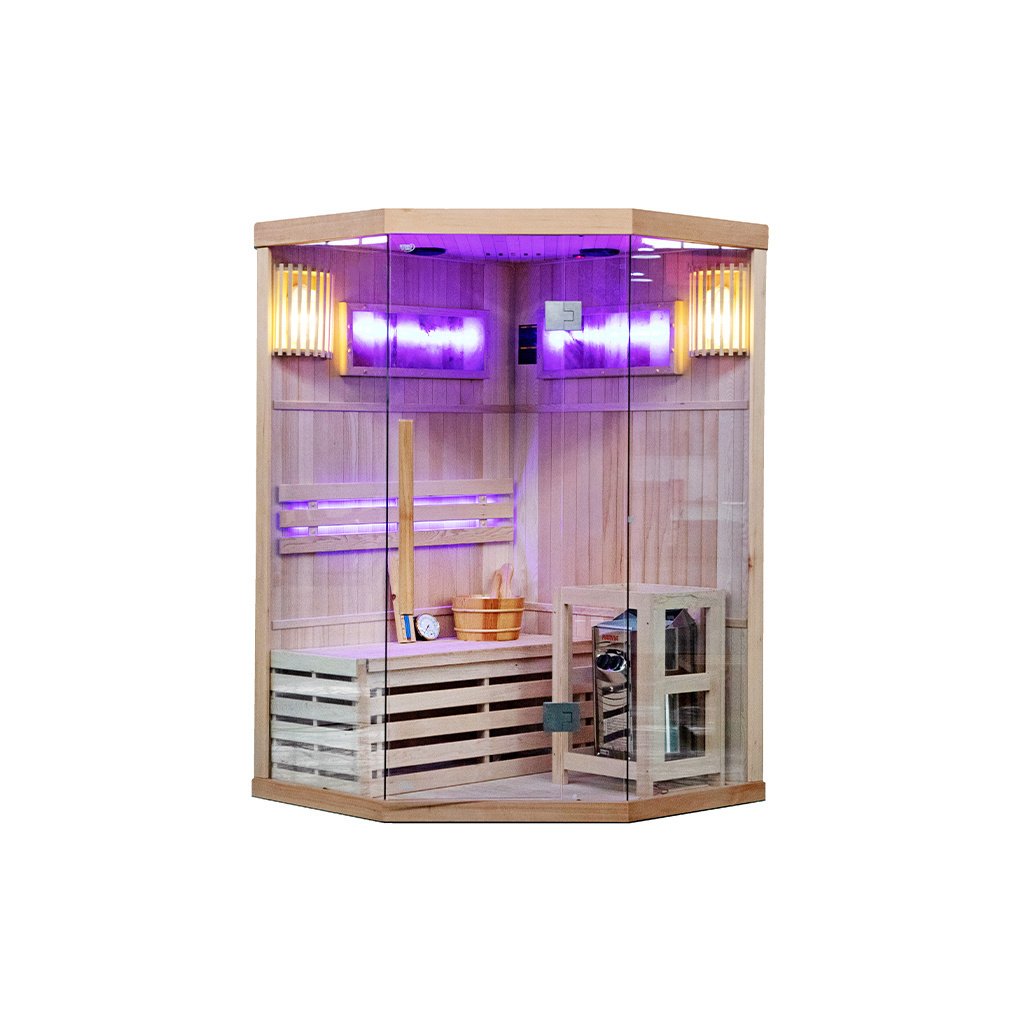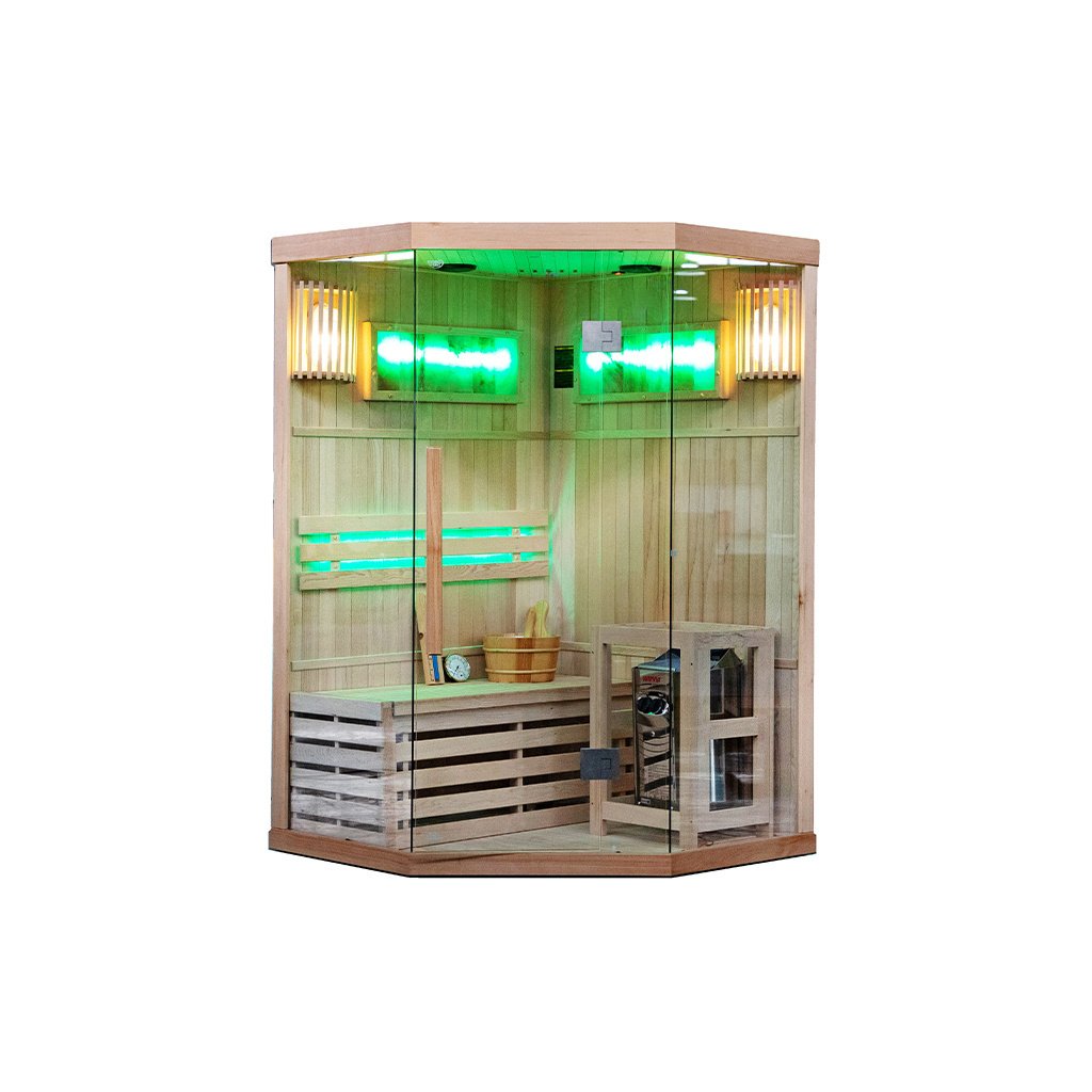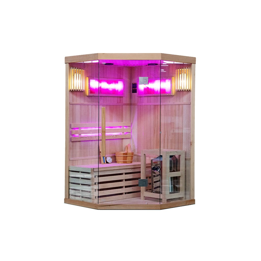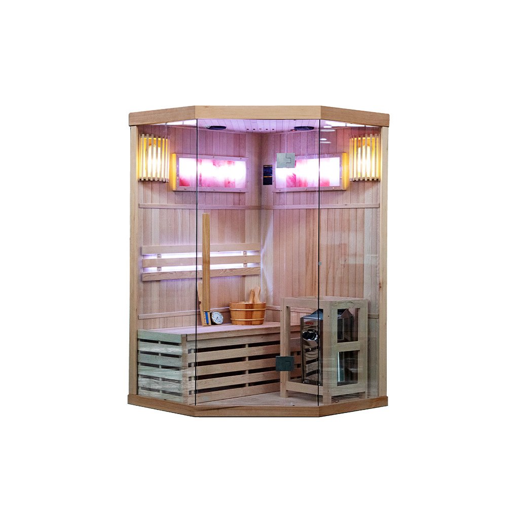 Tradiční finská sauna, známá také jako suchá sauna, je místo, kde teplota vzduchu dosahuje 60 až 85 stupňů Celsia a vlhkost vzduchu se pohybuje mezi 5-15 %. Dosažení tak vysoké teploty je možné díky speciálnímu vařiči, který zahřívá kameny. Interiér kabiny je obohacen o pohodlná sedadla z kanadského jedlového dřeva. Používání tradiční sauny přináší mnoho výhod pro naši pohodu a zdraví. Již po několika sezeních pocítíte vnitřní teplo, které má pozitivní vliv na vaše tělo i mysl. Pravidelné návštěvy sauny stimulují biologické změny v těle, které jsou nezbytné pro udržení homeostázy a psychofyzické rovnováhy. Jedním z klíčových léčebných účinků finské sauny je lipolýza - proces odbourávání triglyceridů a lipidů tukových buněk. Tato účinná terapie bojuje proti celulitidě a pomáhá zpevňovat tělo. Prohřívání těla v sauně zrychluje krevní oběh, což napomáhá vylučování toxinů z těla a zlepšuje celkový stav pokožky. Kromě blahodárných účinků na tělo má tradiční finská sauna pozitivní vliv také na naši mysl. Relaxační a uklidňující klima nám umožňuje oprostit se od každodenního stresu a napětí, což následně přispívá k celkovému pocitu lepší pohody a uvolnění. Tradiční finská sauna je nejen místem, kde můžete pocítit fyzické teplo, ale také objevit její přínos pro zdraví a pohodu těla i mysli. Díky svému účinku na tělo, terapeutické síle a relaxačnímu charakteru je jedním z nejoblíbenějších a nejoceňovanějších míst ve finské kultuře i ve světě. Sauna je navíc vybavena 2 velkými solnými lampami, které navozují jedinečnou atmosféru a mají léčebný účinek na dýchací cesty a pokožku.