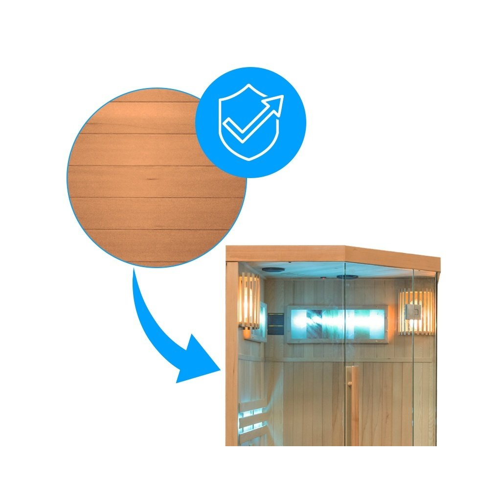 - Sauna je vyrobena z Kanadského jedlovce - Hemlock. Jedná se o nejideálnější materiál pro výrobu saun. Dřevo Hemlock neobsahuje pryskyřici a nevypouští žádné vůně.