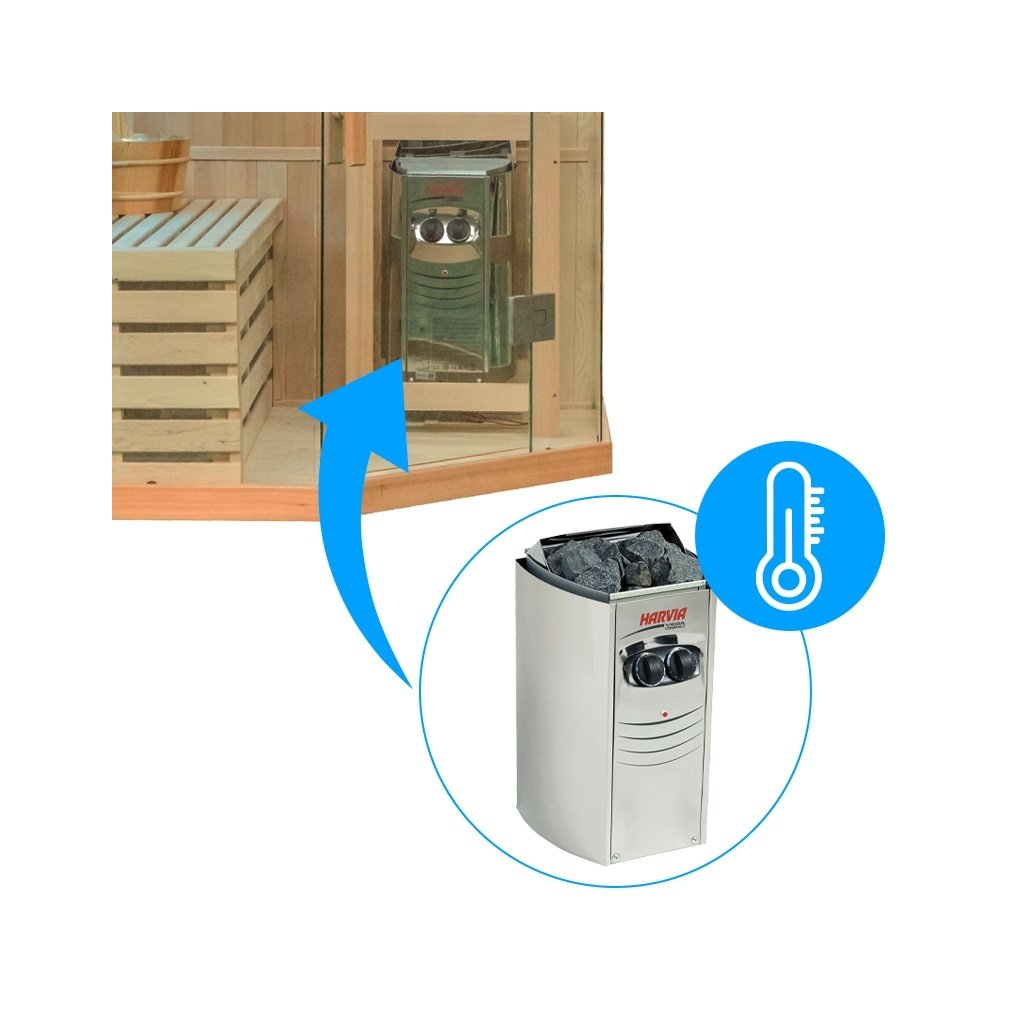 - Vytápění sauny je zajištěno pomocí saunových kamen Harvia Vega BC35 - 3500W (3,5KW) s kameny