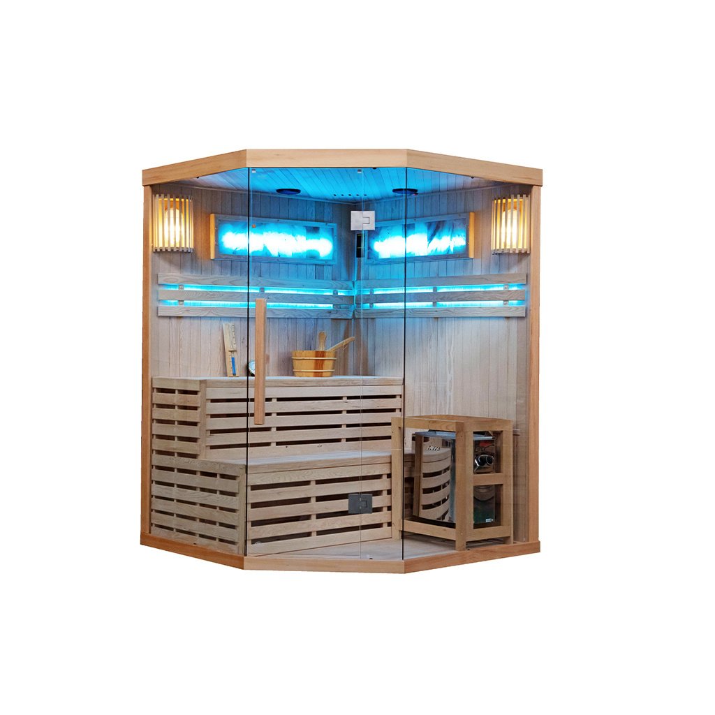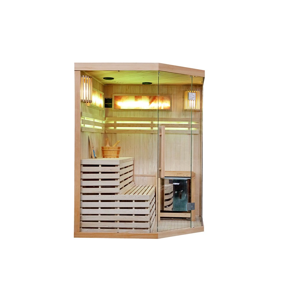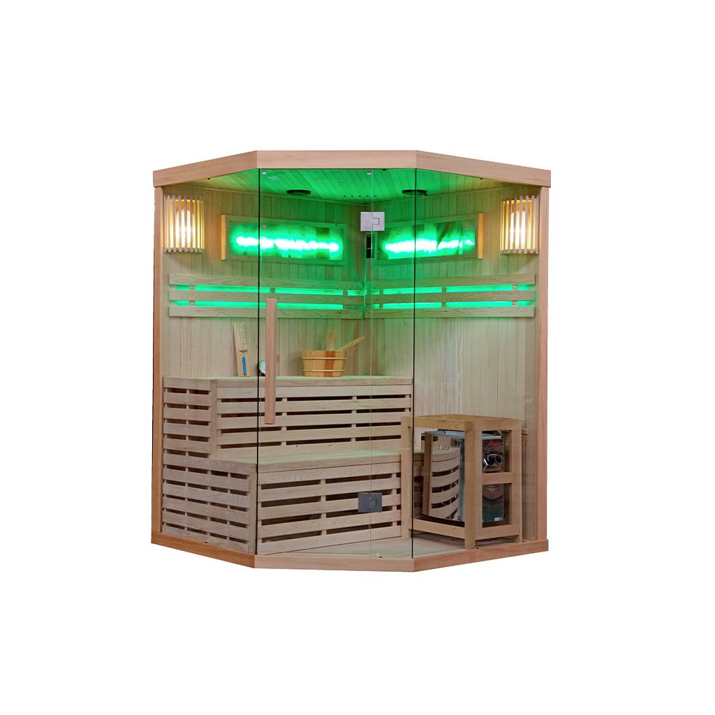 Finská sauna - suchá sauna se zahřívá na vysoké teploty 60 - 110°C s velmi nízkou vlhkostí vzduchu (5-15%). Získat tak vysokou teplotu je možné díky speciálních saunových kamen, které zahřívají kameny. V těchto kamenech se akumuluje potřebné teplo a postupně se tak zahřívá celá sauna na vysokou teplotu. Pravidelné využívání tradiční finské sauny navozuje psychickou pohodu, dodává pocit vnitřního tepla, uvolňuje usazené toxiny a podporuje fyzické i psychické zdraví. Suchou saunu se doporučuje využívat 2x týdně.