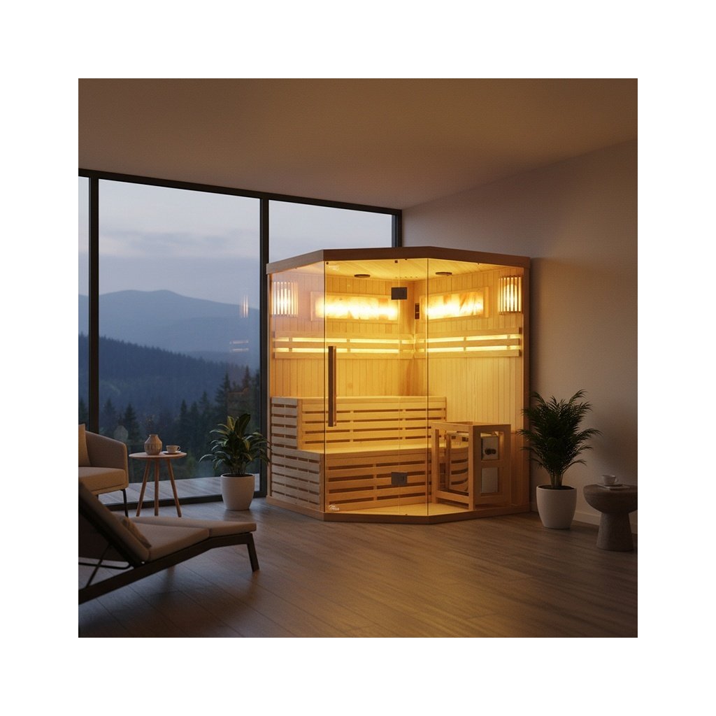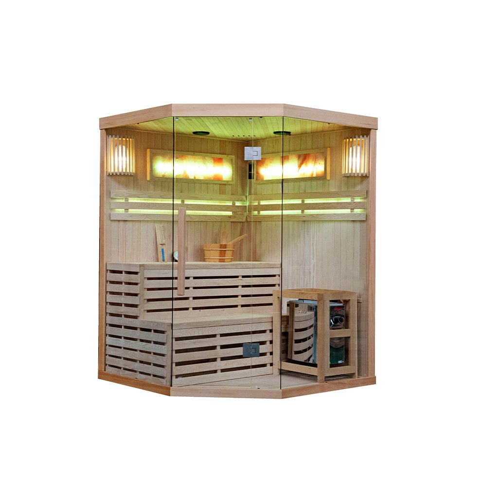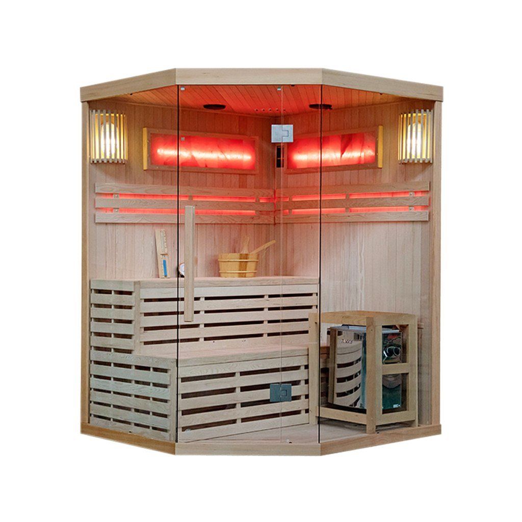 Finská sauna - suchá sauna se zahřívá na vysoké teploty 60 - 110°C s velmi nízkou vlhkostí vzduchu (5-15%). Získat tak vysokou teplotu je možné díky speciálních saunových kamen, které zahřívají kameny. V těchto kamenech se akumuluje potřebné teplo a postupně se tak zahřívá celá sauna na vysokou teplotu. Pravidelné využívání tradiční finské sauny navozuje psychickou pohodu, dodává pocit vnitřního tepla, uvolňuje usazené toxiny a podporuje fyzické i psychické zdraví. Suchou saunu se doporučuje využívat 2x týdně.