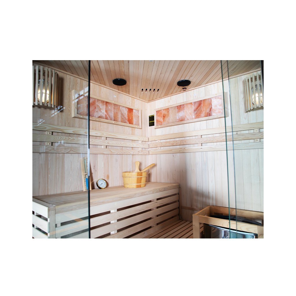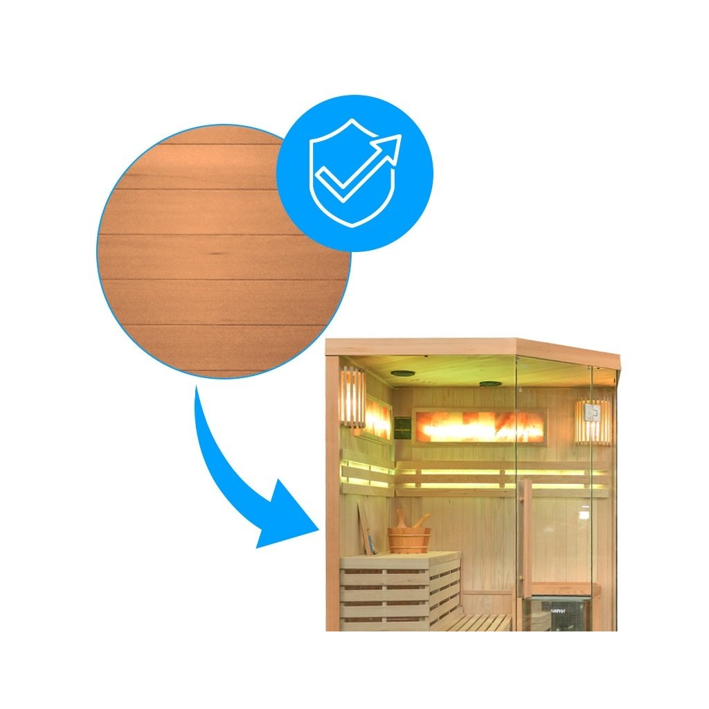 - Sauna je vyrobena z Kanadského jedlovce - Hemlock. Jedná se o nejideálnější materiál pro výrobu saun. Dřevo Hemlock neobsahuje pryskyřici a nevypouští žádné vůně.