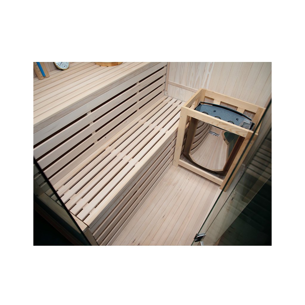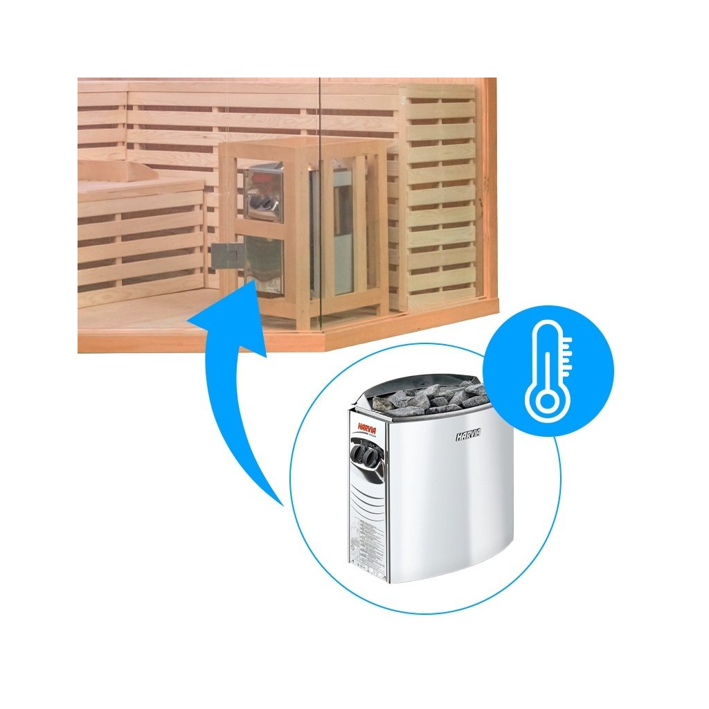 - Vytápění sauny je zajištěno pomocí saunových kamen Harvia Vega BC80 - 8000W (8KW) s kameny