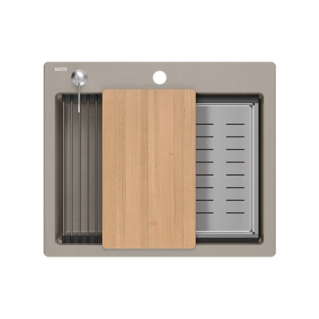 Granitový dřez Kurt 110 Workstation se svým minimalistickým, moderním vzhledem hodí do aranžmá každé kuchyně. Hluboká a prostorná mycí komora zajišťuje vysoký komfort používání. Použitý materiál se vyznačuje mimořádnou životností a odolností vůči různým teplotám a charakteru práce v nich prováděné. Velmi hladký povrch pomáhá udržovat dřez v čistotě.Dřez je dodáván s řadou kuchyňských doplňků: vestavný dávkovač mycího prostředku, bambusové prkénko na krájení, nerezový odkapávač a srolovatelná ocelovo-silikónová podložka, kterou lze použít odkládání mokrých potravin nebo nádobí, ale lze ji použít i jako stojan na horký hrnec. Použití těchto doplňků navíc zvětšuje pracovní plochu v kuchyni a umožňuje úspěšně využívat mycí komoru jako další pracovní místo, pro krájení nebo sušení.